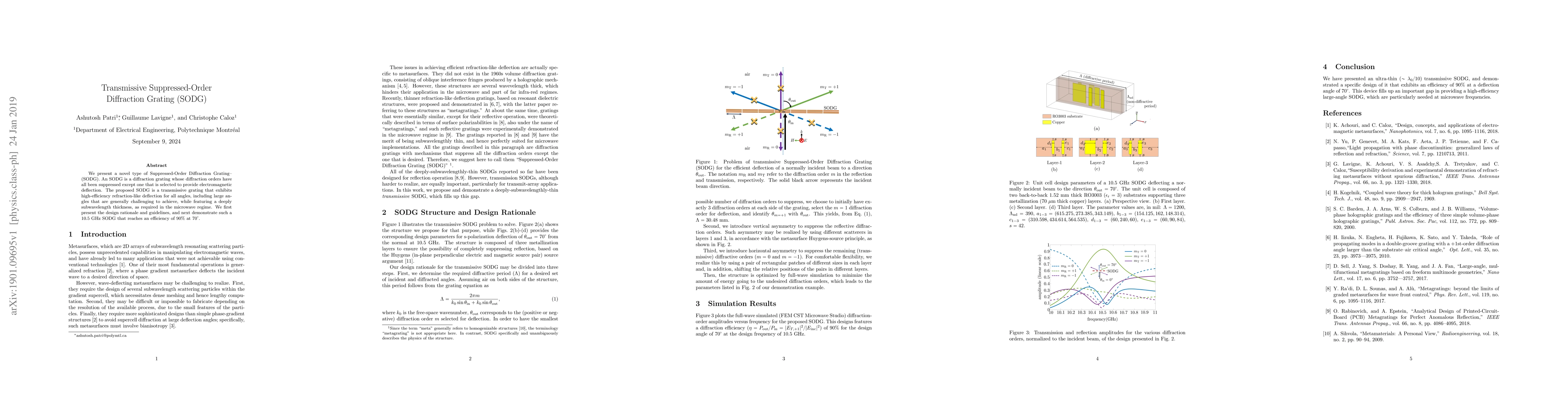 This paper introduces a novel transmissive Suppressed-Order Diffraction Grating (SODG) that efficiently deflects electromagnetic waves at high angles, achieving 90% efficiency at 70 degrees, while maintaining a subwavelength thickness suitable for microwave applications. The design provides a new approach to diffraction gratings with superior performance in challenging deflection scenarios.