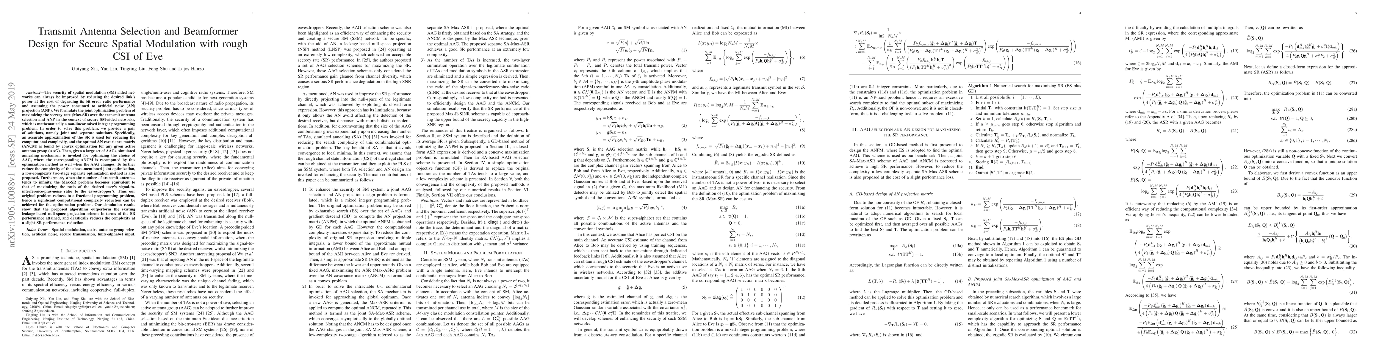 This paper proposes optimization methods for secure spatial modulation networks, focusing on transmit antenna selection and artificial noise projection to maximize secrecy rate while reducing computational complexity. The proposed algorithms outperform existing schemes in terms of secrecy rate performance and significantly reduce computational complexity.