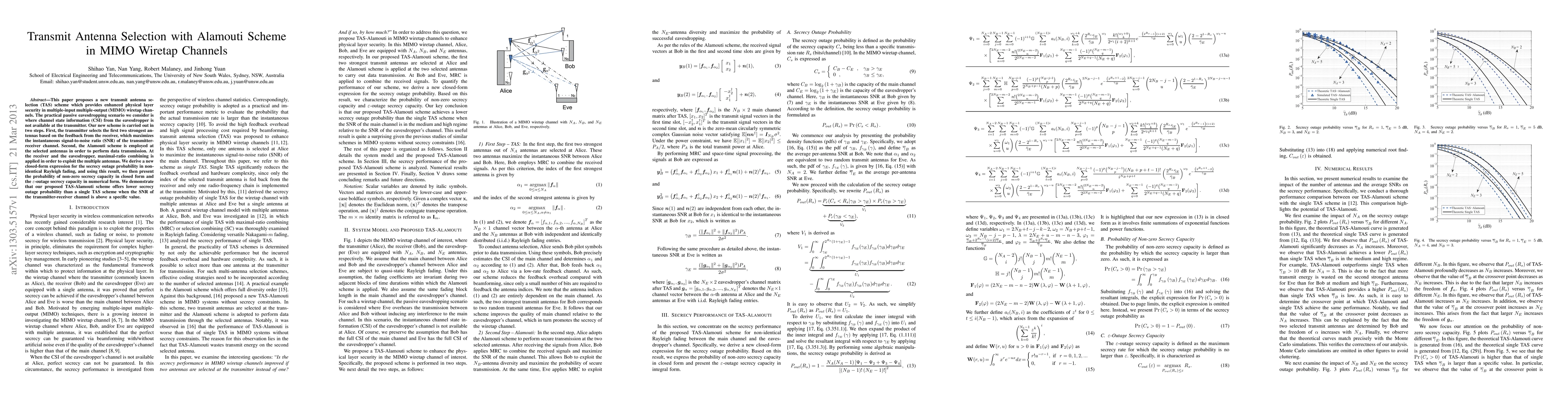 This paper introduces a transmit antenna selection (TAS) scheme with the Alamouti scheme for enhanced security in MIMO wiretap channels, where CSI from the eavesdropper is unavailable at the transmitter. The scheme selects the two strongest antennas based on receiver feedback and employs the Alamouti scheme for data transmission, achieving lower secrecy outage probability compared to a single TAS scheme at higher SNR.