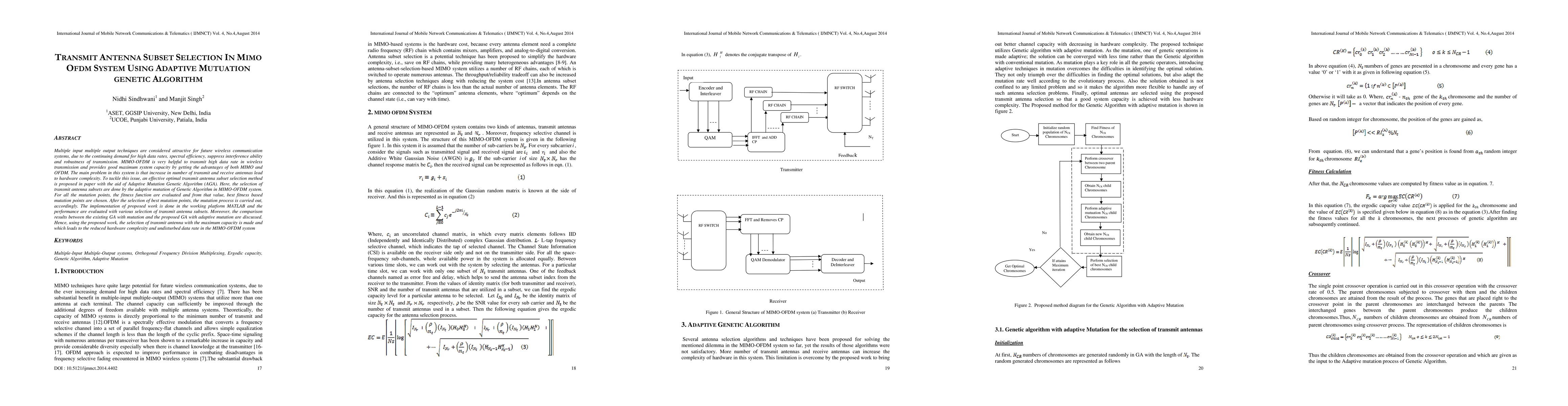 This paper proposes an adaptive mutation Genetic Algorithm (AGA) for optimal transmit antenna subset selection in MIMO-OFDM systems to address hardware complexity. The AGA evaluates fitness functions to select the best mutation points, reducing complexity while maintaining high data rates.