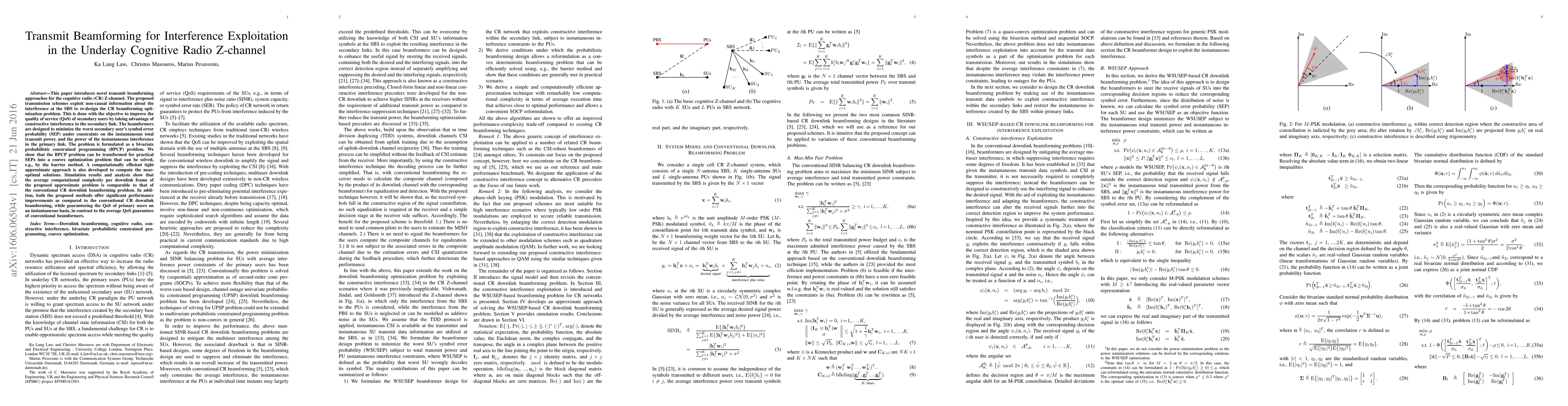 This paper proposes novel transmit beamforming techniques for cognitive radio Z-channels that leverage non-causal interference information to enhance secondary users' QoS through constructive interference. The methods transform the optimization problem into a convex form, offering near-optimal solutions with comparable computational complexity to conventional approaches, while significantly improving performance while maintaining primary users' QoS.