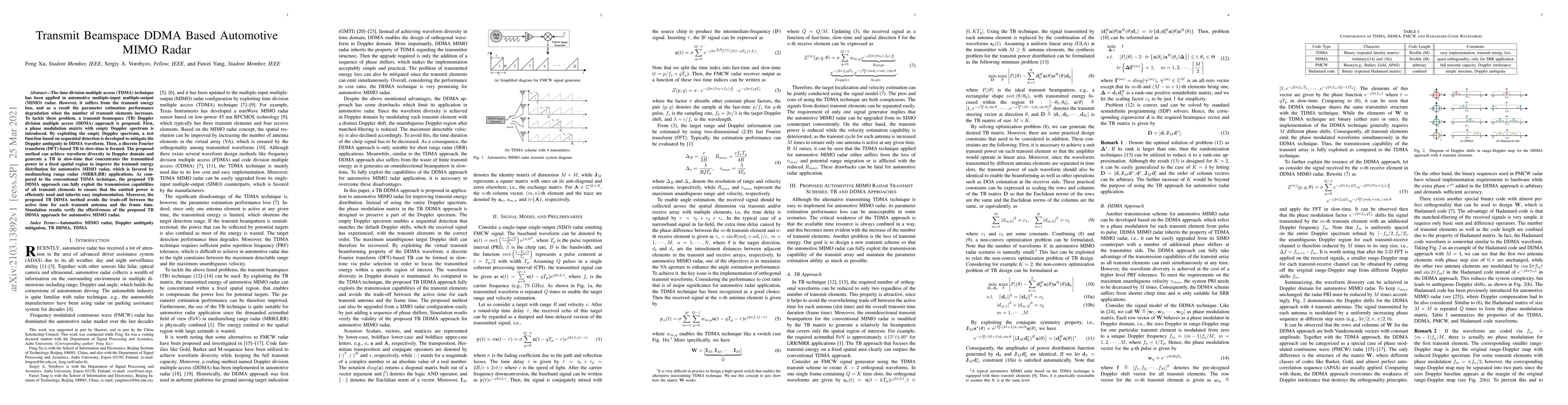 The novelty of this work lies in the integration of transmit beamspace with DDMA, enabling efficient use of transmitted power and mitigation of Doppler ambiguity, which distinguishes it from existing TDMA techniques.