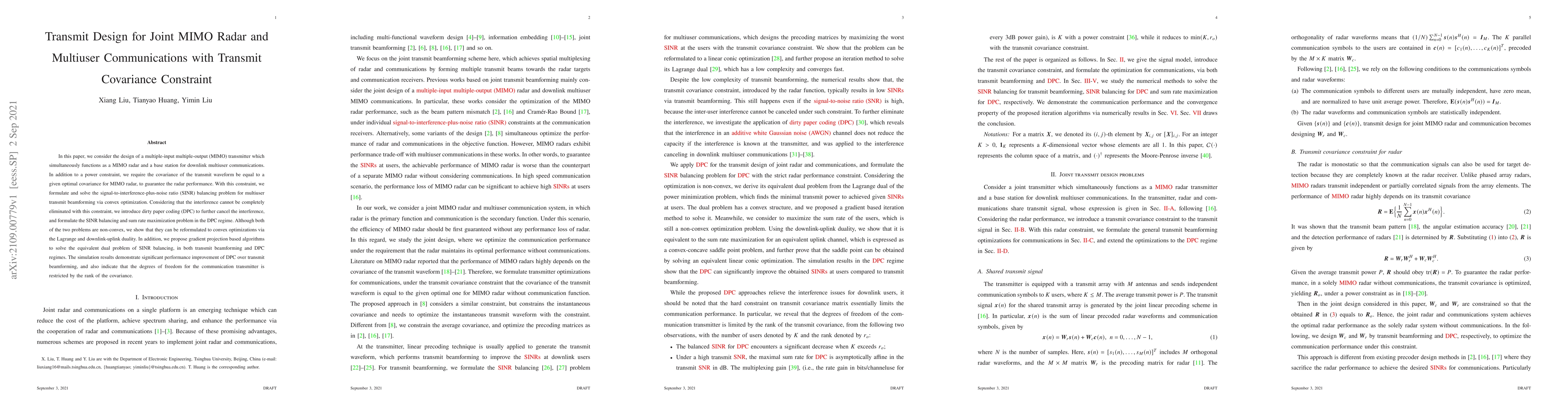 This paper designs a MIMO transmitter for dual MIMO radar and multiuser communication, balancing signal-to-interference-plus-noise ratio (SINR) under a transmit covariance constraint. It employs convex optimization and dirty paper coding (DPC) to maximize sum rate, showing significant performance gains of DPC over traditional beamforming.