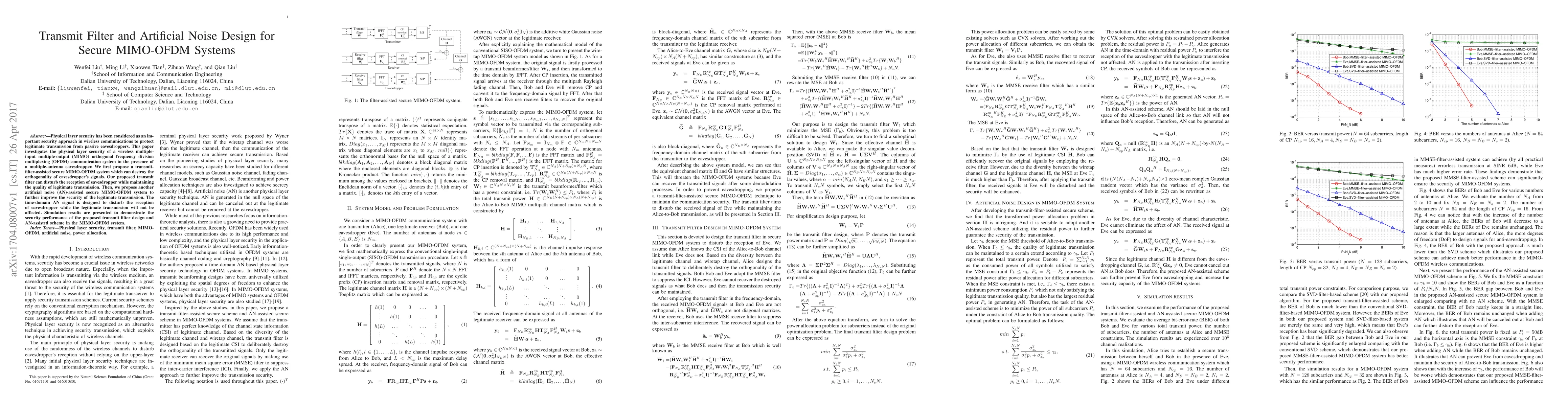 This paper proposes secure transmit filter and artificial noise techniques for MIMO-OFDM systems to thwart passive eavesdroppers. The transmit filter disrupts the orthogonality of eavesdroppers' signals without compromising legitimate transmission quality, while artificial noise further enhances security by disturbing eavesdroppers without affecting legitimate users.