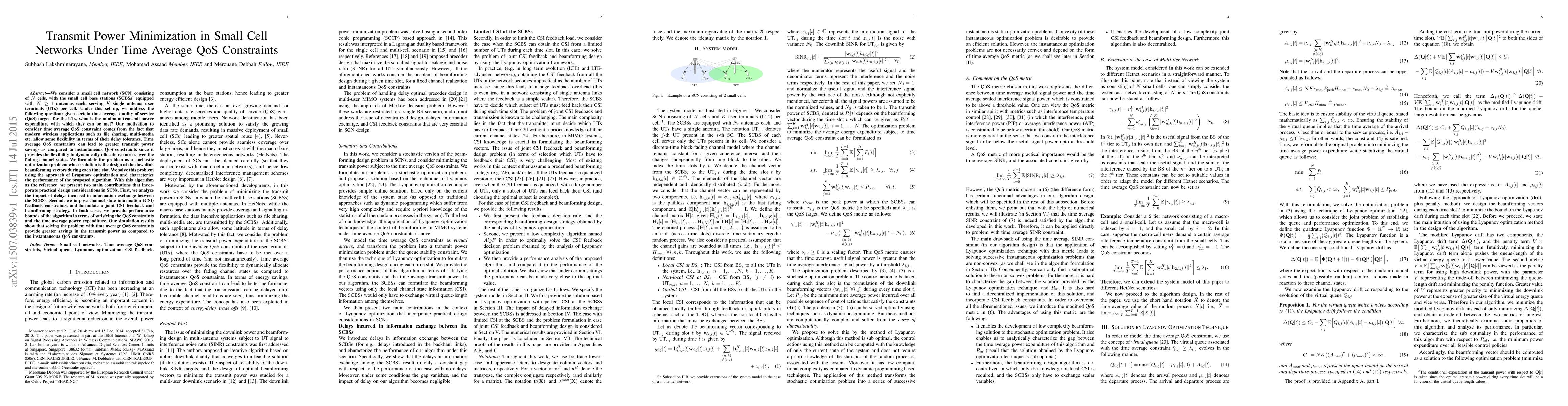 This paper explores transmit power minimization in small cell networks (SCN) under time average quality of service (QoS) constraints, leveraging flexibility in delay-tolerant applications. It formulates the problem as a stochastic optimization problem solved via Lyapunov optimization, analyzing impacts of inter-station delays and channel state information (CSI) feedback constraints, and demonstrating greater power savings compared to instantaneous QoS constraints.
