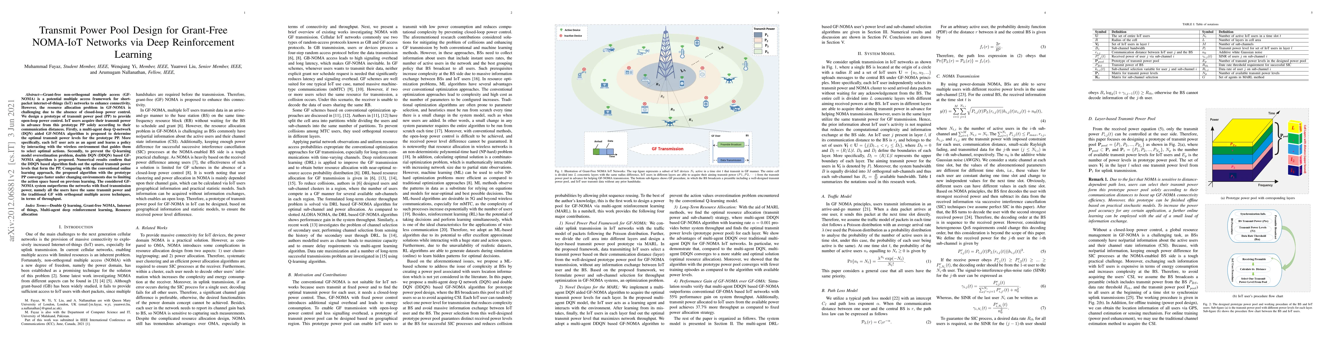 This paper proposes a transmit power pool (PP) for grant-free non-orthogonal multiple access (GF-NOMA) in IoT networks, utilizing a deep reinforcement learning approach to optimize transmit power levels. The multi-agent deep Q-network (DQN) algorithm, enhanced with double DQN, effectively determines the optimal power levels, leading to improved throughput compared to fixed power and traditional GF-OMA techniques.