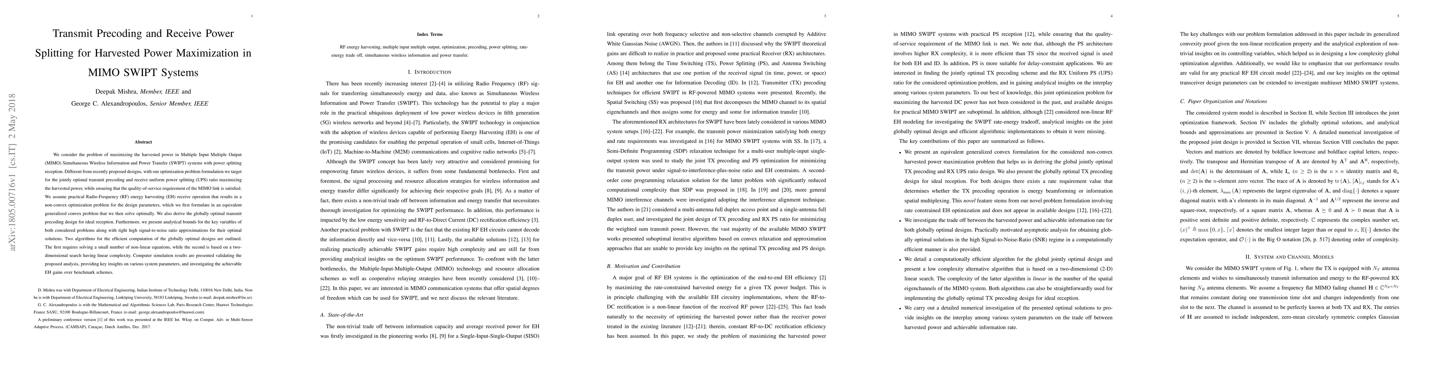The paper presents a methodology for maximizing harvested power in MIMO SWIPT systems by jointly optimizing transmit precoding and receive power splitting ratio, ensuring quality-of-service requirements are met.