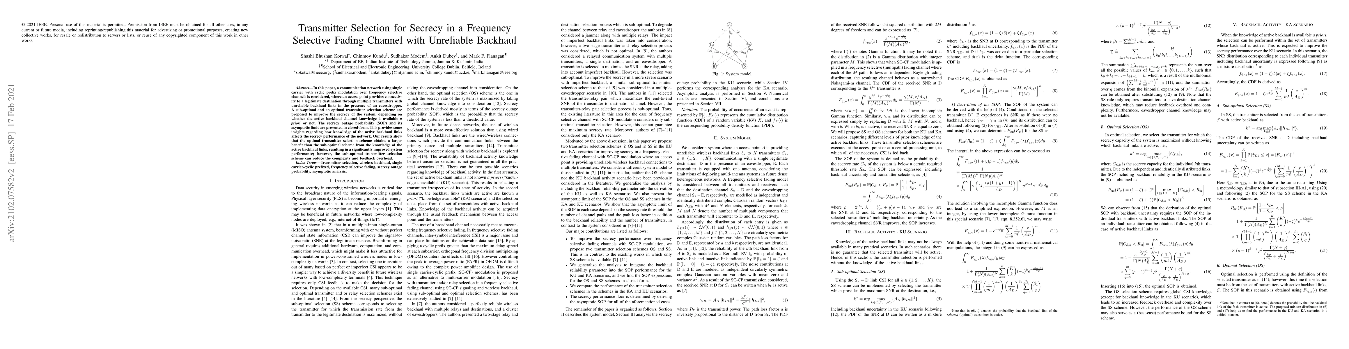 A communication network is designed to improve secrecy in a frequency selective fading channel with unreliable backhaul links. An optimal and sub-optimal transmitter selection scheme are proposed to minimize eavesdropping, showing the latter reduces complexity but not overall performance.