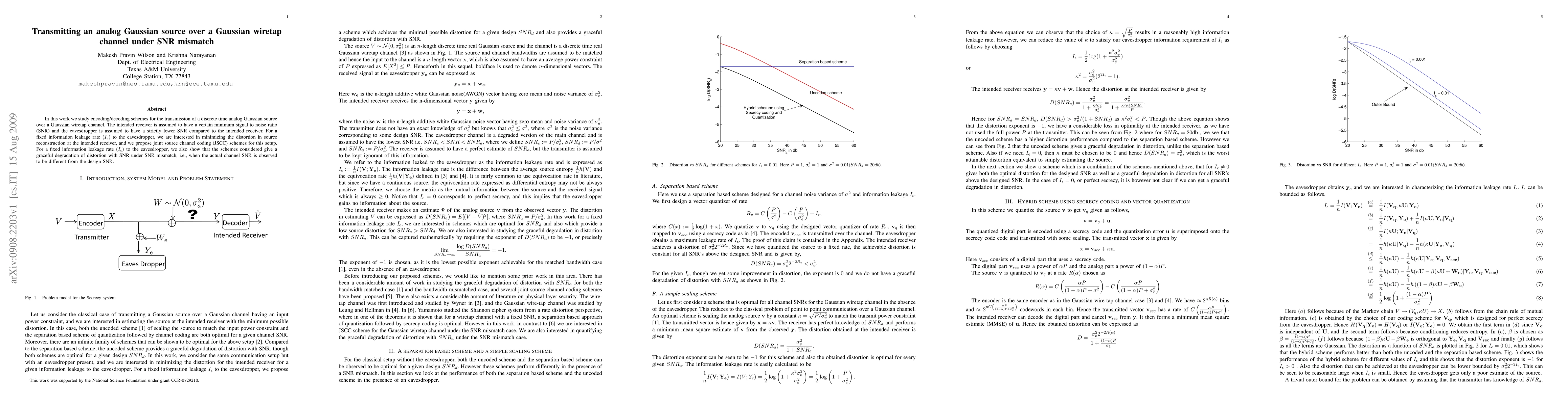 In this work we study encoding/decoding schemes for the transmission of a discrete time analog Gaussian source over a Gaussian wiretap channel. The intended receiver is assumed to have a certain minimum signal to noise ratio (SNR) and the eavesdropper is assumed to have a strictly lower SNR compared to the intended receiver. For a fixed information leakage to the eavesdropper, we are interested in minimizing the distortion in source reconstruction at the intended receiver, and we propose joint source channel coding (JSCC) schemes for this setup. For a fixed information leakage to the eavesdropper, we also show that the schemes considered give a graceful degradation of distortion with SNR under SNR mismatch, i.e., when the actual channel SNR is observed to be different from the design SNR.