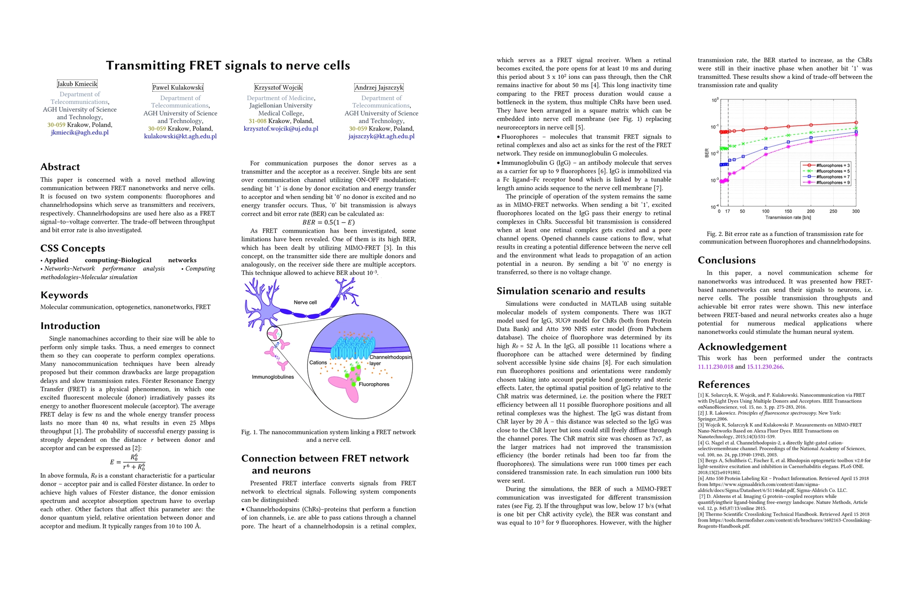 Researchers developed a method to transmit fluorescence resonance energy transfer (FRET) signals to nerve cells using channelrhodopsins as receivers, enabling communication between FRET nanonetworks and biological systems.
