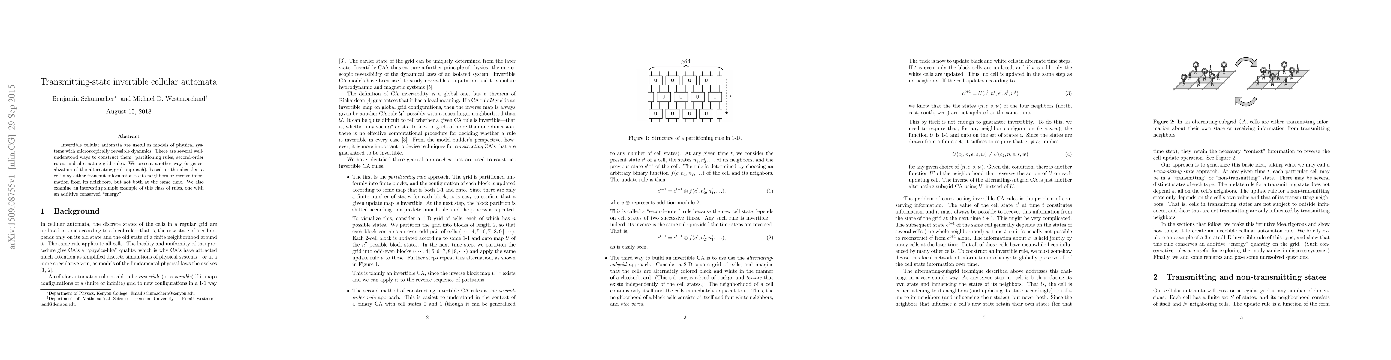 Invertible cellular automata are useful as models of physical systems with microscopically revesible dyanmics. There are several well-understood ways to construct them: partitioning rules, second-order rules, and alternating-grid rules. We present another way (a generalization of the alternating-grid approach), based on the idea that a cell may either transmit information to its neighbors or receive information from its neighbors, but not both at the same time. We also examine an interesting simple example of this class of rules, one with an additive conserved "energy".