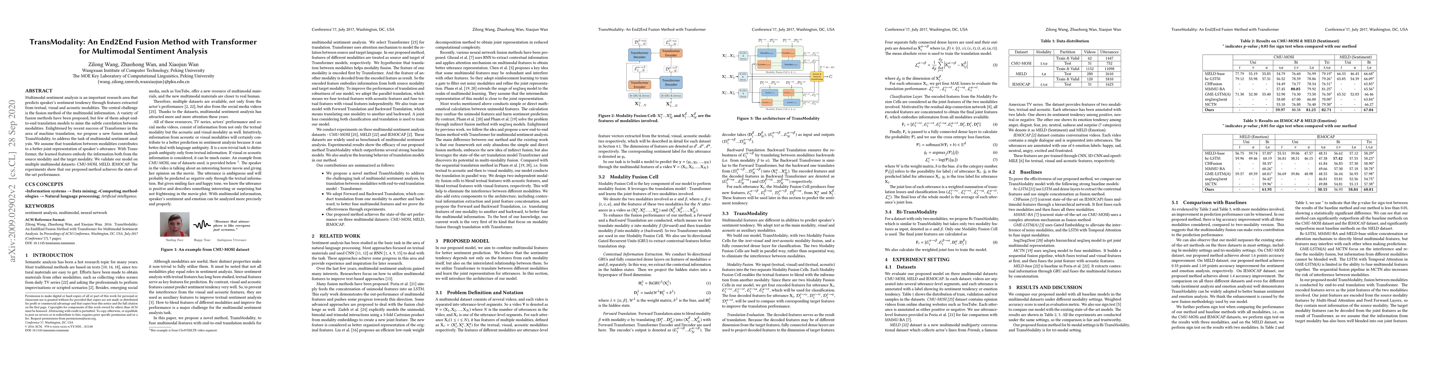 TransModality employs a Transformer-based end-to-end fusion method for multimodal sentiment analysis, leveraging translation between modalities to enhance joint representation. The method achieves state-of-the-art performance on datasets like CMU-MOSI, MELD, and IEMOCAP.