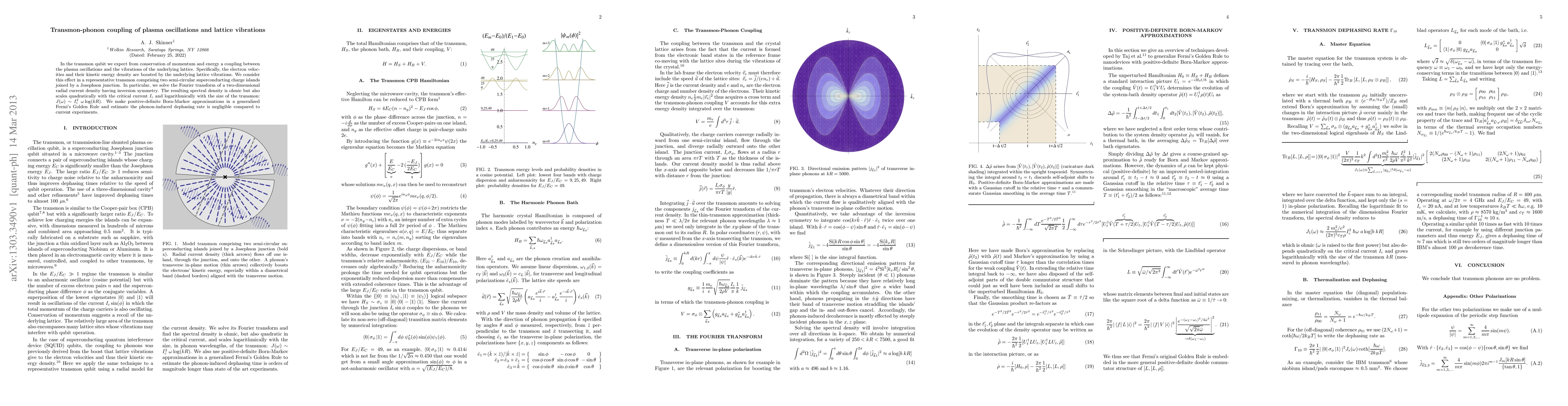 In the transmon qubit we expect from conservation of momentum and energy a coupling between the plasma oscillations and the vibrations of the underlying lattice. Specifically, the electron velocities and their kinetic energy density are boosted by the underlying lattice vibrations. We consider this effect in a representative transmon comprising two semi-circular superconducting charge islands joined by a Josephson junction. In particular, we solve the Fourier transform of a two-dimensional radial current density having inversion symmetry. The resulting spectral density is ohmic but also scales quadratically with the critical current I_c and logarithmically with the size of the transmon: J(w) ~ I_c^2 w log(kR). We make positive-definite Born-Markov approximations in a generalized Fermi's Golden Rule and estimate the phonon-induced dephasing rate is negligible compared to current experiments.