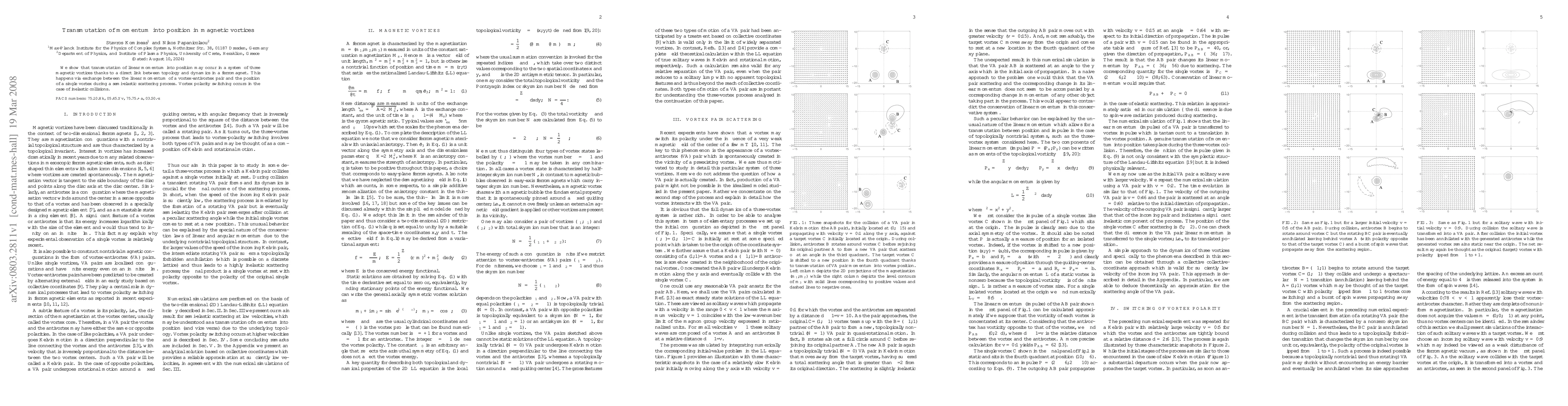 Summary: This study demonstrates that linear momentum can be converted into position in a system of three magnetic vortices, facilitated by a topological-dynamical link in a ferromagnet, where momentum exchange occurs during semi-elastic scattering, with vortex polarity switching in inelastic collisions.