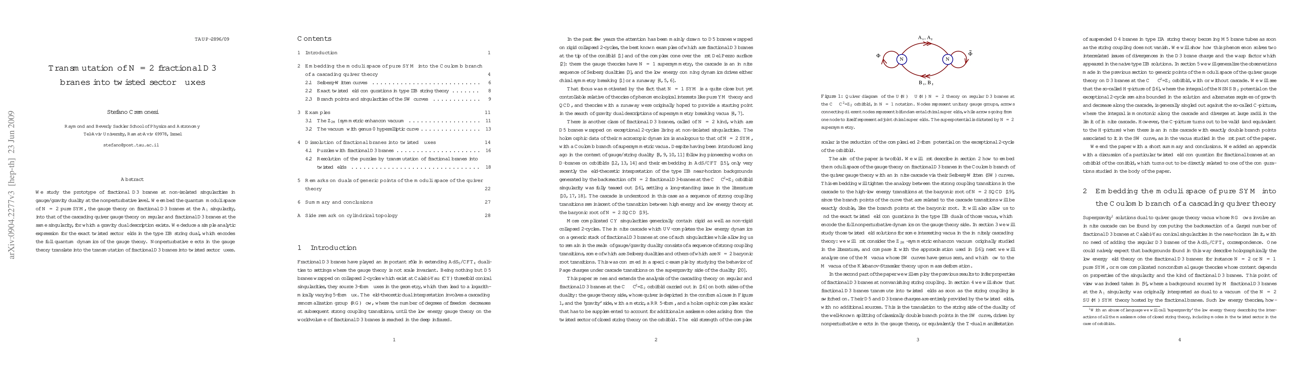 We study the prototype of fractional D3 branes at non-isolated singularities in gauge/gravity duality at the nonperturbative level. We embed the quantum moduli space of N=2 SU(M) pure SYM, the gauge theory on fractional D3 branes at the A_1 singularity, into that of the cascading quiver gauge theory on regular and fractional D3 branes at the same singularity, for which a gravity dual description exists. We deduce a simple analytic expression for the exact twisted sector fields in the type IIB string dual, which encodes the full quantum dynamics of the gauge theory. Nonperturbative effects in the gauge theory translate into the transmutation of fractional D3 branes into twisted sector fluxes.