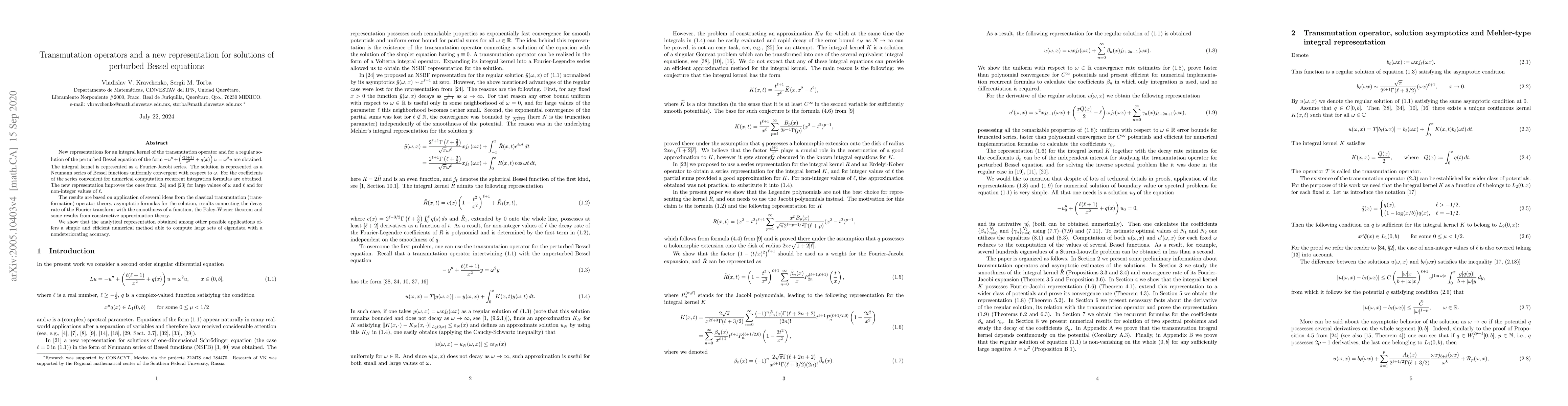 This paper presents new representations for the transmutation operator's integral kernel and solutions of perturbed Bessel equations, expressed as a Fourier-Jacobi series and a Neumann series. The new analytical representation improves existing methods for large values of $\omega$ and $\ell$, and is efficient for numerical computation.