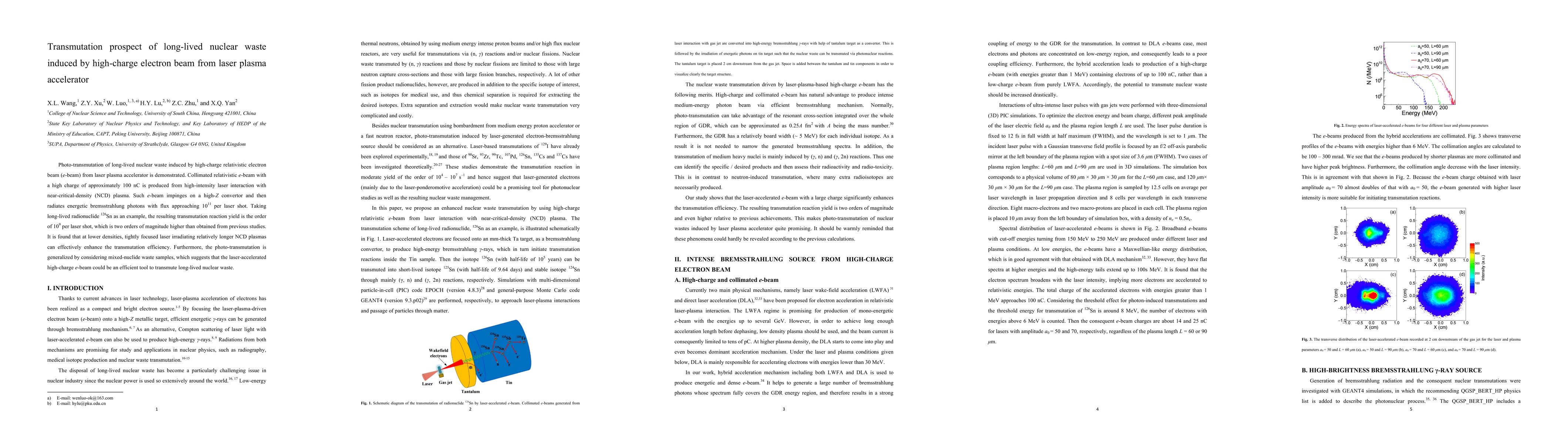 Photo-transmutation of long-lived nuclear waste induced by high-charge relativistic electron beam (e-beam) from laser plasma accelerator is demonstrated. Collimated relativistic e-beam with a high charge of approximately 100 nC is produced from high-intensity laser interaction with near-critical-density (NCD) plasma. Such e-beam impinges on a high-Z convertor and then radiates energetic bremsstrahlung photons with flux approaching 10^{11} per laser shot. Taking long-lived radionuclide ^{126}Sn as an example, the resulting transmutation reaction yield is the order of 10^{9} per laser shot, which is two orders of magnitude higher than obtained from previous studies. It is found that at lower densities, tightly focused laser irradiating relatively longer NCD plasmas can effectively enhance the transmutation efficiency. Furthermore, the photo-transmutation is generalized by considering mixed-nuclide waste samples, which suggests that the laser-accelerated high-charge e-beam could be an efficient tool to transmute long-lived nuclear waste.