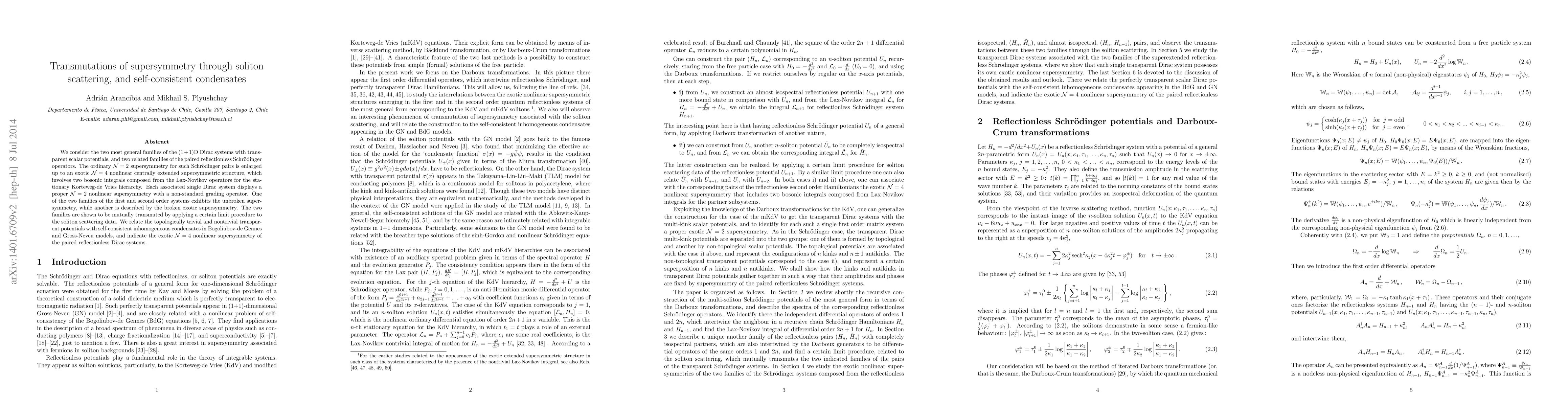 This paper explores the transformation of supersymmetry in (1+1)D Dirac systems and related Schrödinger operators, revealing an enlarged N=4 nonlinear supersymmetric structure. It demonstrates how two families of these systems can be transmuted through soliton scattering, linking transparent potentials with self-consistent condensates in Bogoliubov-de Gennes and Gross-Neveu models.