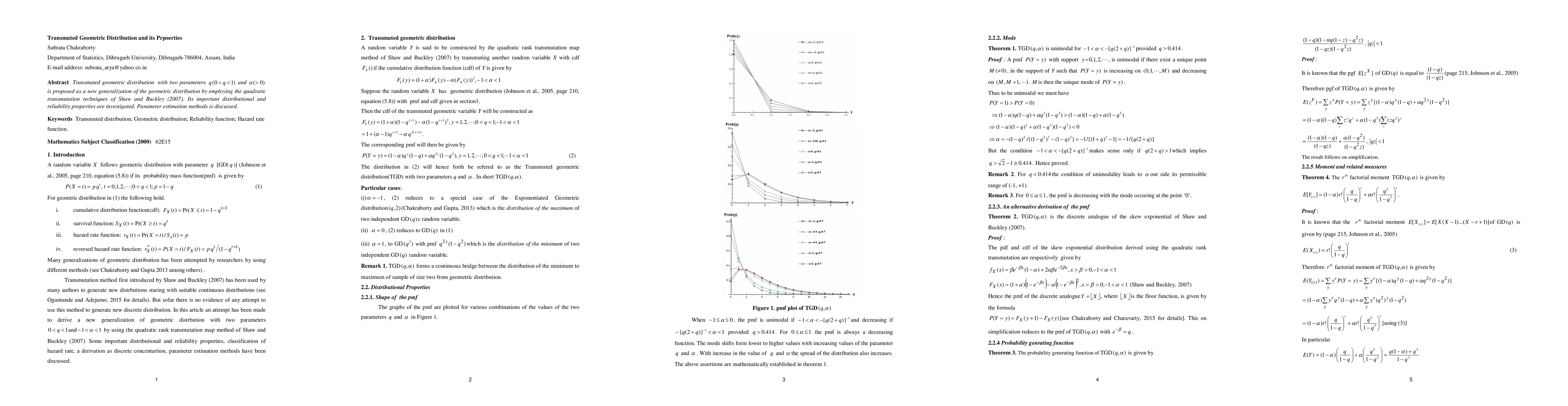 Transmuted geometric distribution with two parameters and is proposed as a new generalization of the geometric distribution by employing the quadratic transmutation techniques of Shaw and Buckley (2007). Its important distributional and reliability properties are investigated. Parameter estimation methods is discussed.