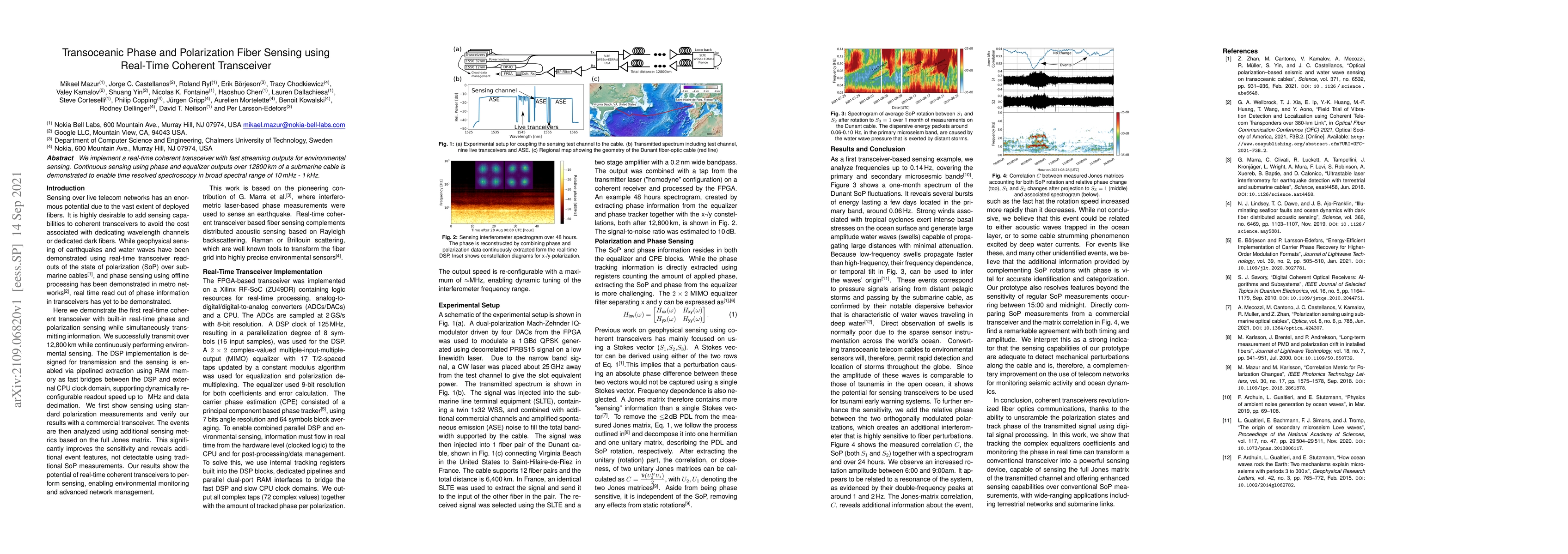 We implement a real-time coherent transceiver with fast streaming outputs for environmental sensing. Continuous sensing using phase and equalizer outputs over 12800km of a submarine cable is demonstrated to enable time resolved spectroscopy in broad spectral range of 10mHz - 1kHz.