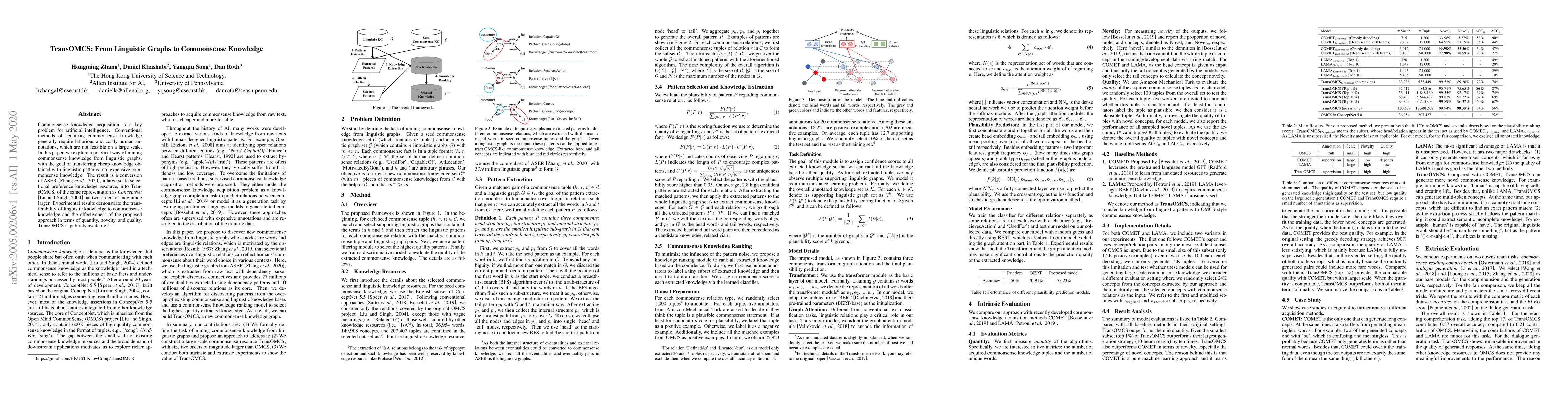 This paper presents TransOMCS, a method to convert large-scale linguistic knowledge from ASER into commonsense knowledge comparable to ConceptNet, aiming to reduce reliance on costly human annotations. Experimental results show the effectiveness of the approach in terms of quantity, novelty, and quality.