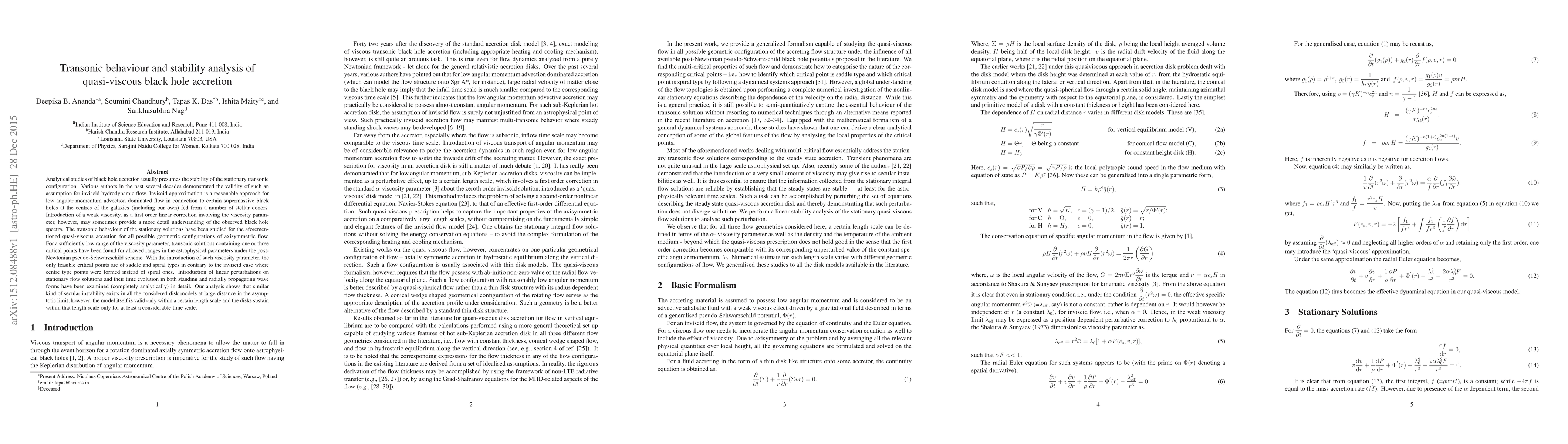 This paper investigates the transonic behavior and stability of quasi-viscous black hole accretion flows, introducing a weak viscosity parameter to provide a more detailed understanding of observed spectra. Analytical studies reveal that the introduction of viscosity alters critical points from centres to saddles and spirals, and linear perturbations show secular instability in disk models over large distances, though the model remains valid within a specific length scale.