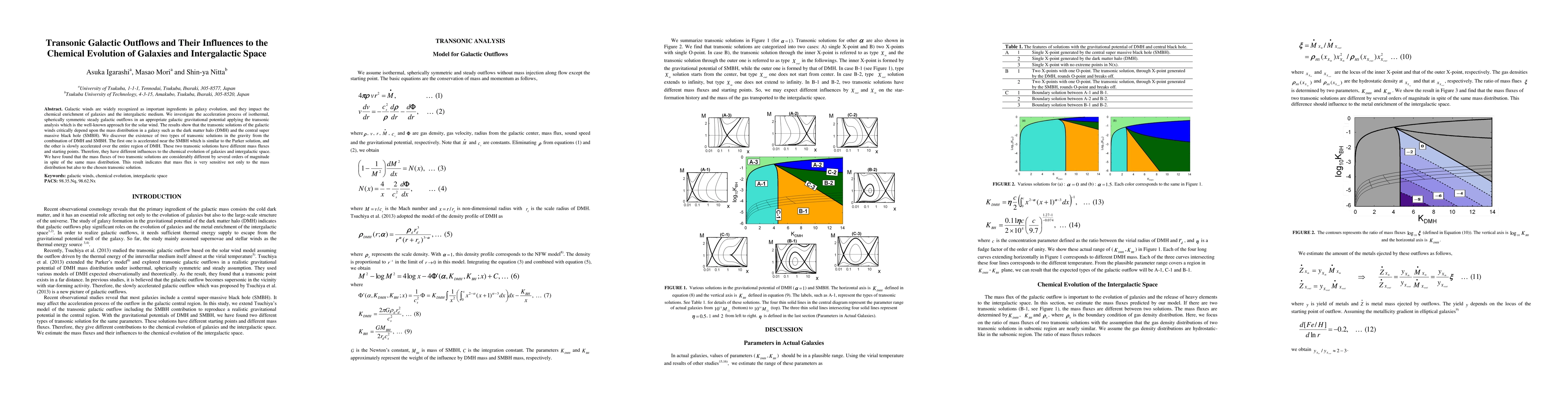 This paper categorizes transonic solutions of galactic outflows influenced by the gravitational potential of dark matter halos (DMH) and supermassive black holes (SMBH), finding that SMBH generates a distinct transonic branch. It concludes that these different transonic solutions impact star formation rates, galaxy evolution, and the chemical evolution of intergalactic space, emphasizing the importance of the selected transonic solution in addition to mass distribution.
