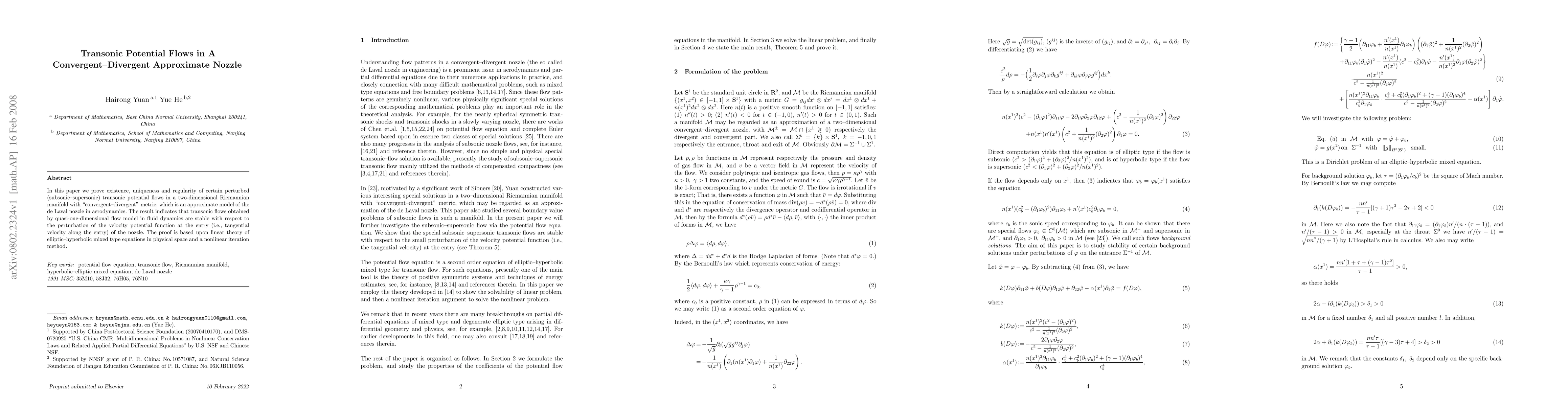 In this paper we prove existence, uniqueness and regularity of certain perturbed (subsonic--supersonic) transonic potential flows in a two-dimensional Riemannian manifold with "convergent-divergent" metric, which is an approximate model of the de Laval nozzle in aerodynamics. The result indicates that transonic flows obtained by quasi-one-dimensional flow model in fluid dynamics are stable with respect to the perturbation of the velocity potential function at the entry (i.e., tangential velocity along the entry) of the nozzle. The proof is based upon linear theory of elliptic-hyperbolic mixed type equations in physical space and a nonlinear iteration method.