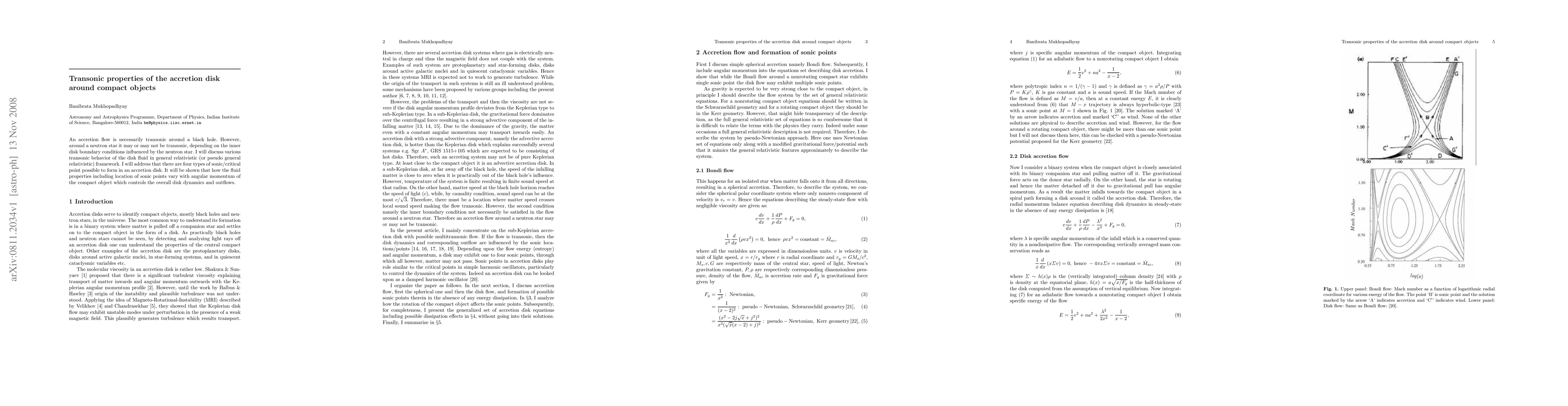 This paper explores the transonic properties of accretion disks around compact objects, specifically black holes and neutron stars, within a general relativistic framework. It identifies four types of sonic points in the disk and examines how fluid properties and the location of these points are influenced by the angular momentum of the compact object.