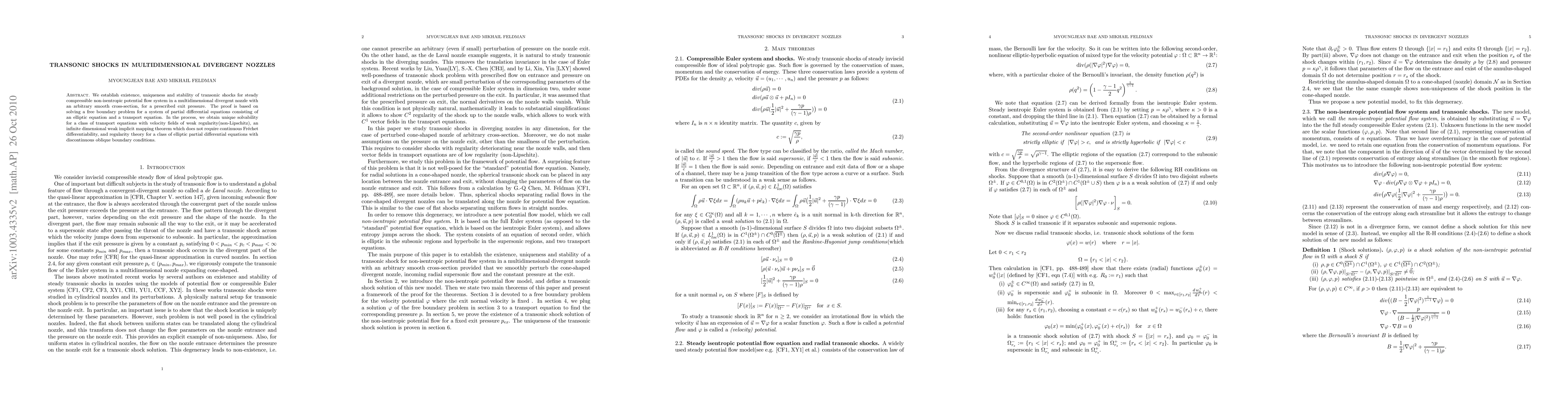 This paper establishes the existence, uniqueness, and stability of transonic shocks in multidimensional divergent nozzles for steady compressible non-isentropic potential flow, proving these results through a solution to a free boundary problem for a system of partial differential equations. The study also introduces unique solvability for transport equations with weak regularity velocity fields and develops an infinite-dimensional weak implicit mapping theorem.