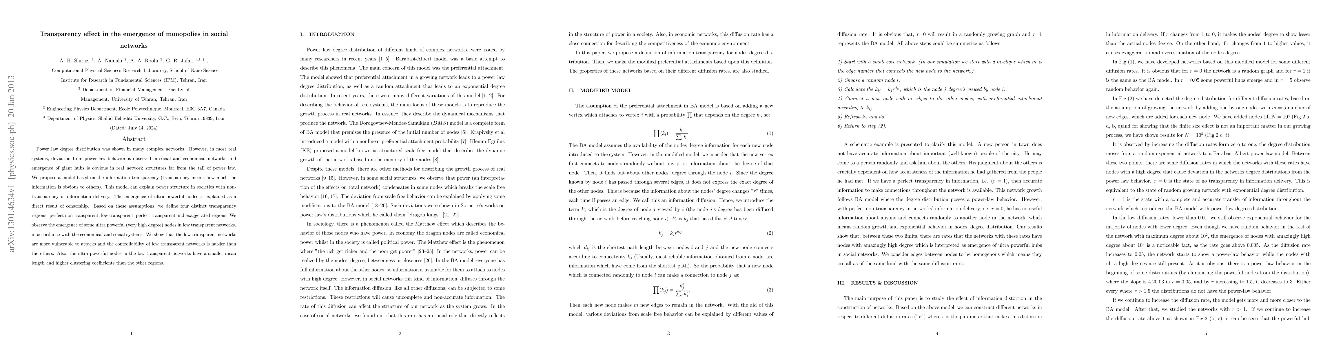 Power law degree distribution was shown in many complex networks. However, in most real systems, deviation from power-law behavior is observed in social and economical networks and emergence of giant hubs is obvious in real network structures far from the tail of power law. We propose a model based on the information transparency (transparency means how much the information is obvious to others). This model can explain power structure in societies with non-transparency in information delivery. The emergence of ultra powerful nodes is explained as a direct result of censorship. Based on these assumptions, we define four distinct transparency regions: perfect non-transparent, low transparent, perfect transparent and exaggerated regions. We observe the emergence of some ultra powerful (very high degree) nodes in low transparent networks, in accordance with the economical and social systems. We show that the low transparent networks are more vulnerable to attacks and the controllability of low transparent networks is harder than the others. Also, the ultra powerful nodes in the low transparent networks have a smaller mean length and higher clustering coefficients than the other regions.