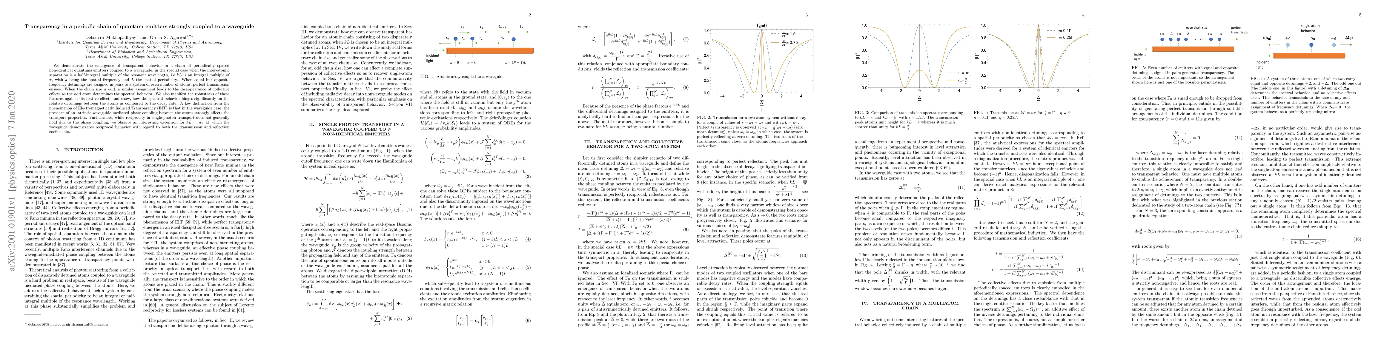 This paper demonstrates transparent behavior in a periodic chain of quantum emitters coupled to a waveguide, showing perfect transmission when atoms are paired with equal but opposite frequency detunings. The study highlights the influence of waveguide-mediated phase coupling, revealing reciprocal behavior under specific conditions.