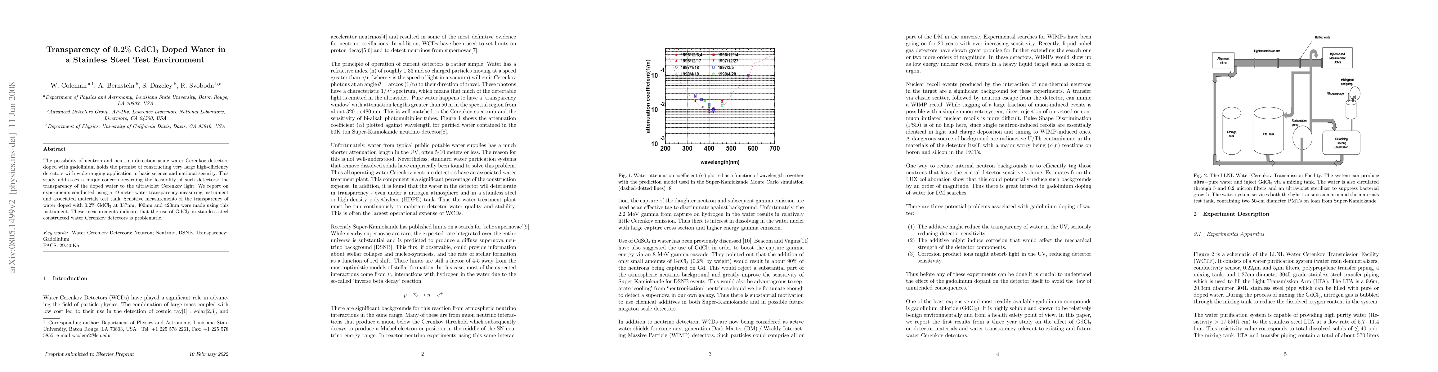 This study investigates the transparency of 0.2% GdCl3 doped water for ultraviolet Cerenkov light, crucial for neutron and neutrino detection. Experiments reveal that GdCl3 is not suitable as a dopant for stainless steel water Cerenkov detectors due to insufficient transparency.