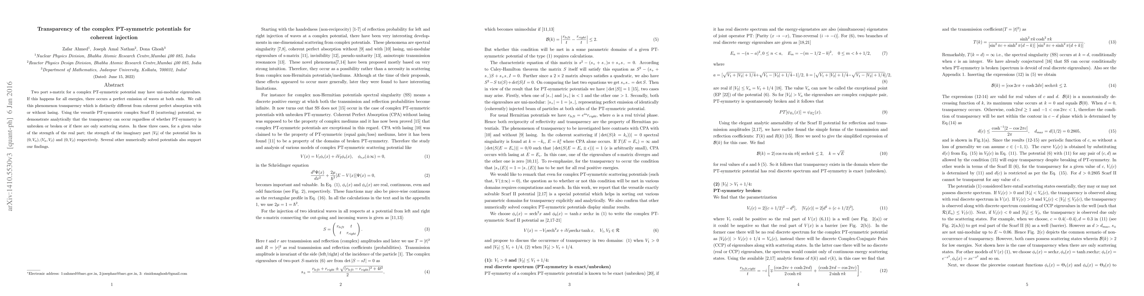 Two port s-matrix for a complex PT-symmetric potential may have uni-modular eigenvalues. If this happens for all energies, there occurs a perfect emission of waves at both ends. We call this phenomenon transparency which is distinctly different from coherent perfect absorption with or without lasing. Using the versatile PT-symmetric complex Scarf II (scattering) potential, we demonstrate analytically that the transparency can occur regardless of whether PT-symmetry is unbroken or broken or if there are only scattering states. In these three cases, for a given value of the strength of the real part; the strength of the imaginary part $|V_2|$ of the potential lies in $(0, V_{\alpha}), (V_{\alpha}, V_{\beta})$ and $(0,V_{\beta})$ respectively. Several other numerically solved potentials also support our findings.