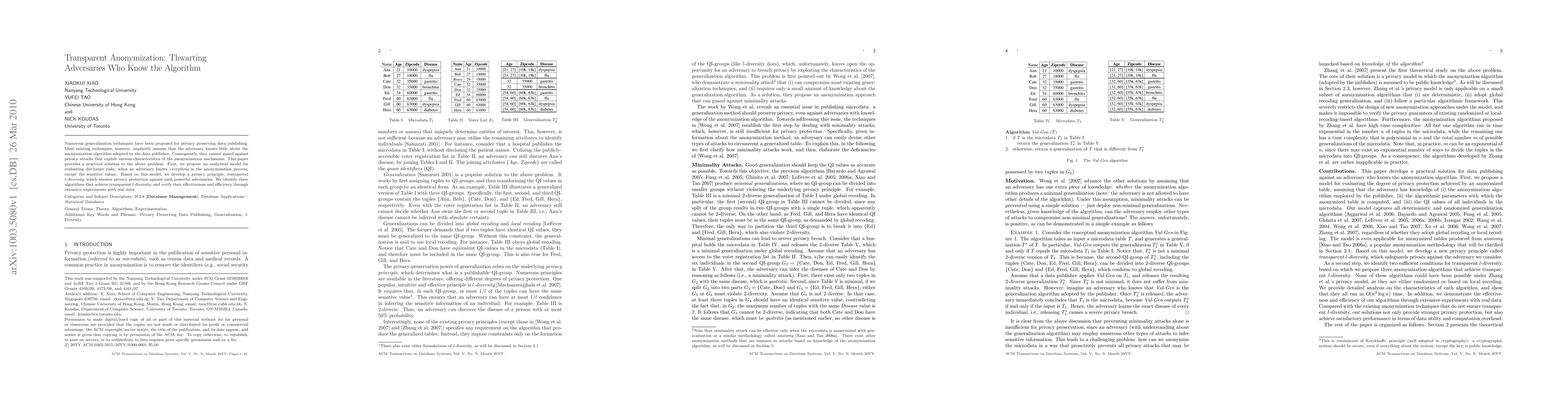 Numerous generalization techniques have been proposed for privacy preserving data publishing. Most existing techniques, however, implicitly assume that the adversary knows little about the anonymization algorithm adopted by the data publisher. Consequently, they cannot guard against privacy attacks that exploit various characteristics of the anonymization mechanism. This paper provides a practical solution to the above problem. First, we propose an analytical model for evaluating disclosure risks, when an adversary knows everything in the anonymization process, except the sensitive values. Based on this model, we develop a privacy principle, transparent l-diversity, which ensures privacy protection against such powerful adversaries. We identify three algorithms that achieve transparent l-diversity, and verify their effectiveness and efficiency through extensive experiments with real data.