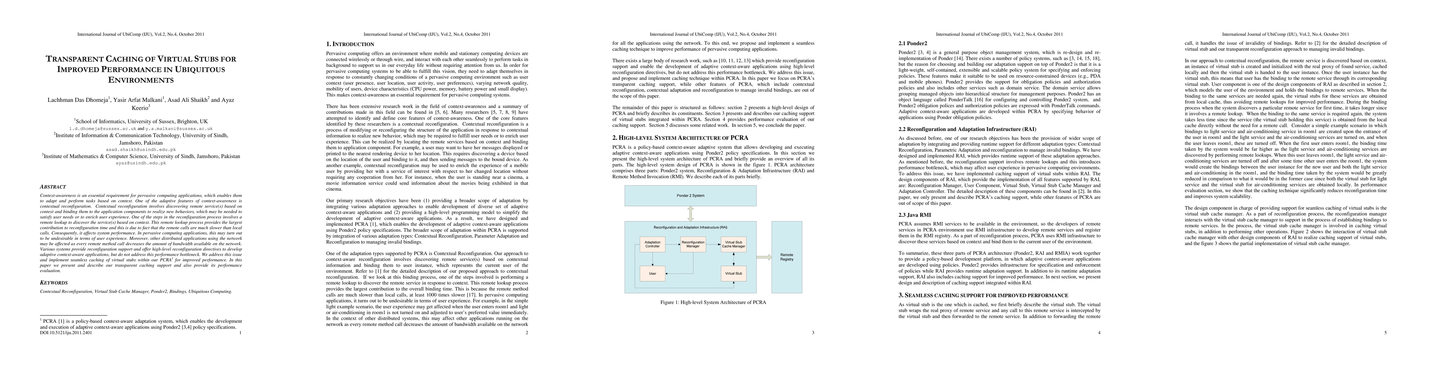 Context-awareness is an essential requirement for pervasive computing applications, which enables them to adapt and perform tasks based on context. One of the adaptive features of context-awareness is contextual reconfiguration. Contextual reconfiguration involves discovering remote service(s) based on context and binding them to the application components to realize new behaviors, which may be needed to satisfy user needs or to enrich user experience. One of the steps in the reconfiguration process involves a remote lookup to discover the service(s) based on context. This remote lookup process provides the largest contribution to reconfiguration time and this is due to fact that the remote calls are much slower than local calls. Consequently, it affects system performance. In pervasive computing applications, this may turn out to be undesirable in terms of user experience. Moreover, other distributed applications using the network may be affected as every remote method call decreases the amount of bandwidth available on the network. Various systems provide reconfiguration support and offer high-level reconfiguration directives to develop adaptive context-aware applications, but do not address this performance bottleneck. We address this issue and implement seamless caching of virtual stubs within our PCRA1 for improved performance. In this paper we present and describe our transparent caching support and also provide its performance evaluation.