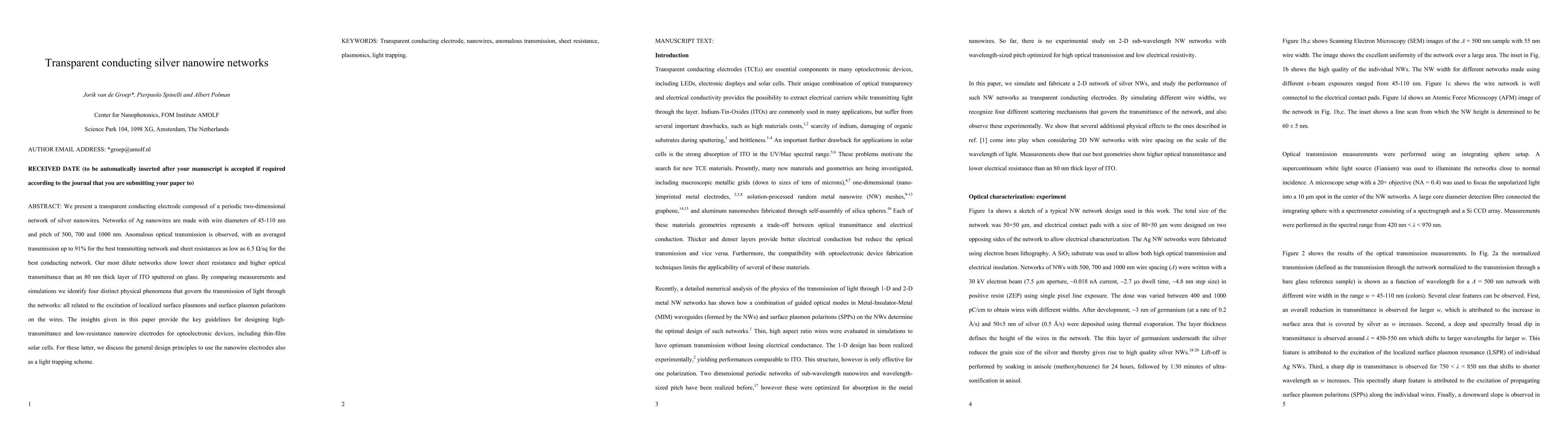 This paper presents a transparent conducting electrode made from a two-dimensional network of silver nanowires, achieving high optical transmission (up to 91%) and low sheet resistance (as low as 6.5 Ω/sq). The study identifies four physical phenomena related to surface plasmons governing light transmission, offering guidelines for designing efficient nanowire electrodes for optoelectronic applications.