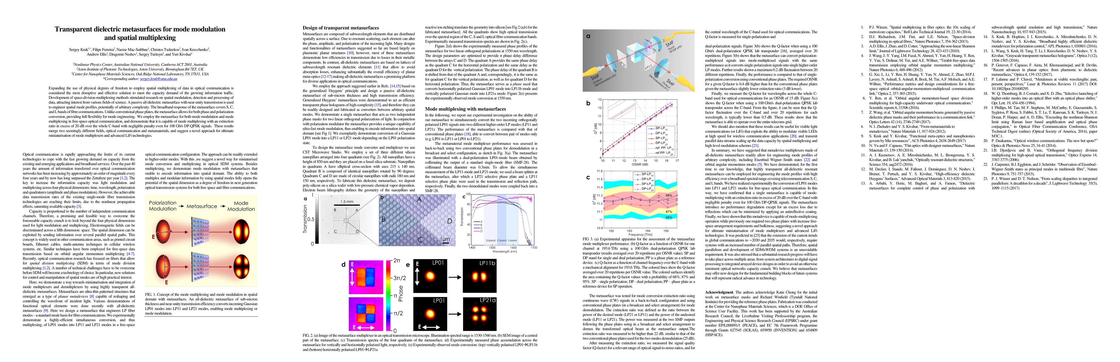 This paper presents a transparent dielectric metasurface for spatial mode modulation and multiplexing in optical communication, achieving high-efficiency mode multiplexing over the C-band with negligible penalty for 100 Gb/s signals, merging optical communication and metamaterials for advanced data transmission.