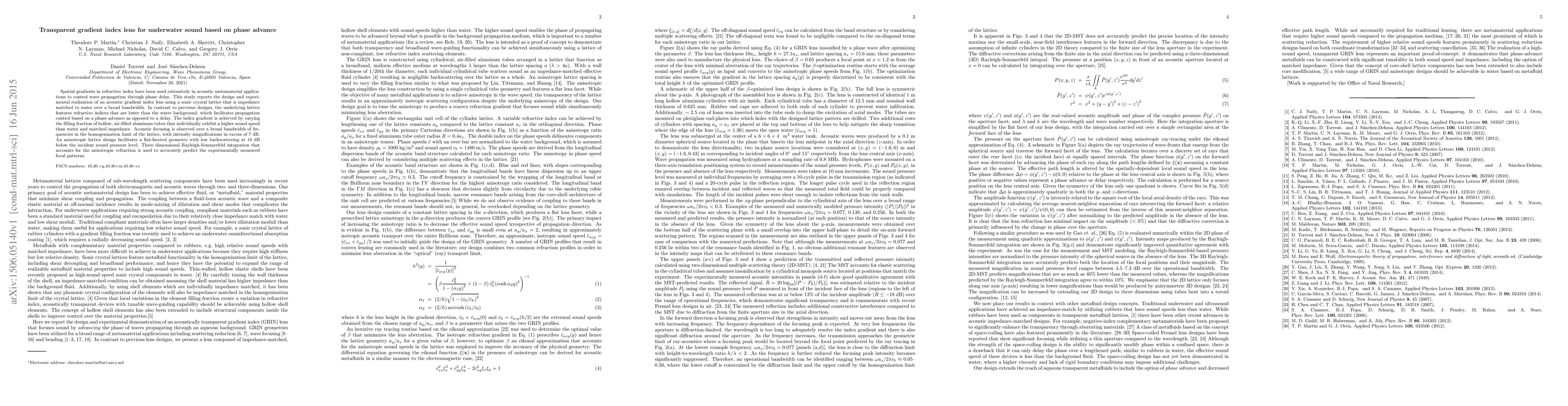 Spatial gradients in refractive index have been used extensively in acoustic metamaterial applications to control wave propagation through phase delay. This study reports the design and experimental realization of an acoustic gradient index lens using a sonic crystal lattice that is impedance matched to water over a broad bandwidth. In contrast to previous designs, the underlying lattice features refractive indices that are lower than the water background, which facilitates propagation control based on a phase advance as opposed to a delay. The index gradient is achieved by varying the filling fraction of hollow, air-filled aluminum tubes that individually exhibit a higher sound speed than water and matched impedance. Acoustic focusing is observed over a broad bandwidth of frequencies in the homogenization limit of the lattice, with intensity magnifications in excess of 7 dB. An anisotropic lattice design facilitates a flat-faceted geometry with low backscattering at 18 dB below the incident sound pressure level. Three dimensional Rayleigh-Sommerfeld integration that accounts for the anisotropic refraction is used to accurately predict the experimentally measured focal patterns.