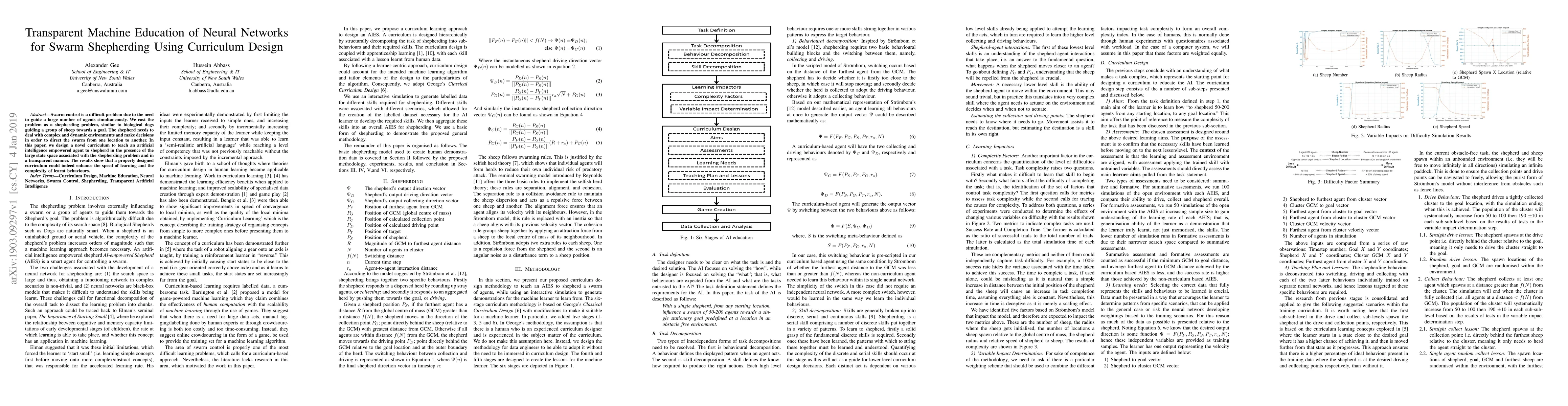This paper proposes a transparent machine education curriculum to train neural networks for guiding swarms of agents, akin to shepherding. The curriculum enhances learning speed and complexity of behaviors, demonstrating effective swarm control in dynamic environments.