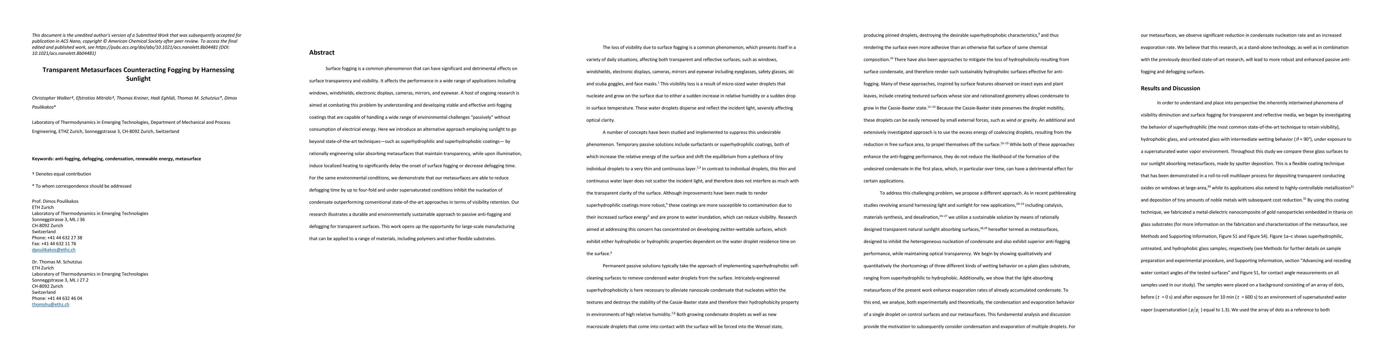 Surface fogging is a common phenomenon that can have significant and detrimental effects on surface transparency and visibility. It affects the performance in a wide range of applications including windows, windshields, electronic displays, cameras, mirrors, and eyewear. A host of ongoing research is aimed at combating this problem by understanding and developing stable and effective anti-fogging coatings that are capable of handling a wide range of environmental challenges "passively" without consumption of electrical energy. Here we introduce an alternative approach employing sunlight to go beyond state-of-the-art techniques---such as superhydrophilic and superhydrophobic coatings---by rationally engineering solar absorbing metasurfaces that maintain transparency, while upon illumination, induce localized heating to significantly delay the onset of surface fogging or decrease defogging time. For the same environmental conditions, we demonstrate that our metasurfaces are able to reduce defogging time by up to four-fold and under supersaturated conditions inhibit the nucleation of condensate outperforming conventional state-of-the-art approaches in terms of visibility retention. Our research illustrates a durable and environmentally sustainable approach to passive anti-fogging and defogging for transparent surfaces. This work opens up the opportunity for large-scale manufacturing that can be applied to a range of materials, including polymers and other flexible substrates.
