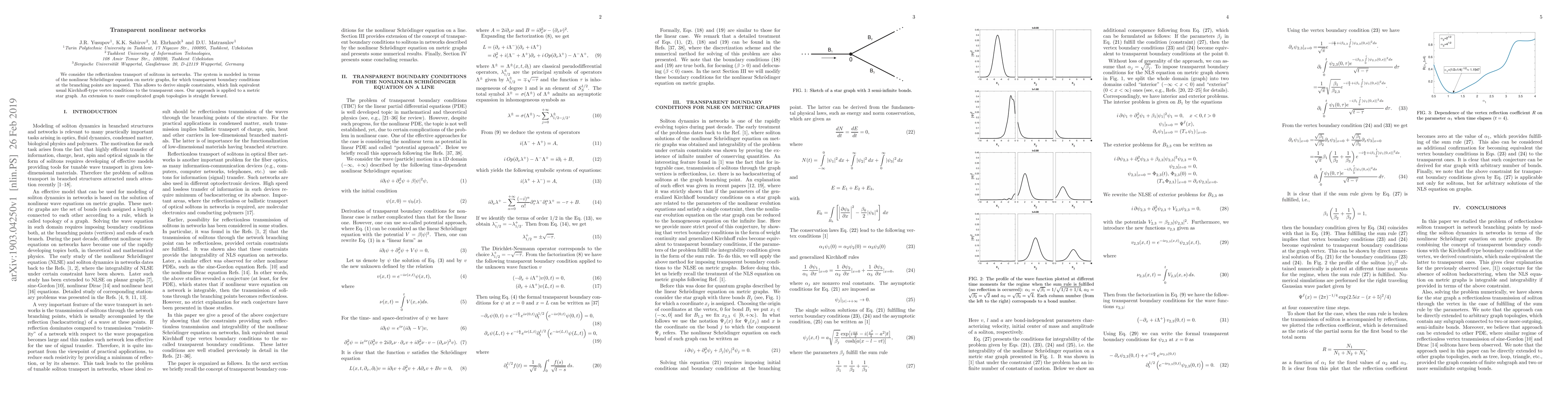 Researchers developed a method to analyze solitons in networks with transparent boundary conditions, simplifying constraints for reflectionless transport. Their approach can be applied to various graph topologies.
