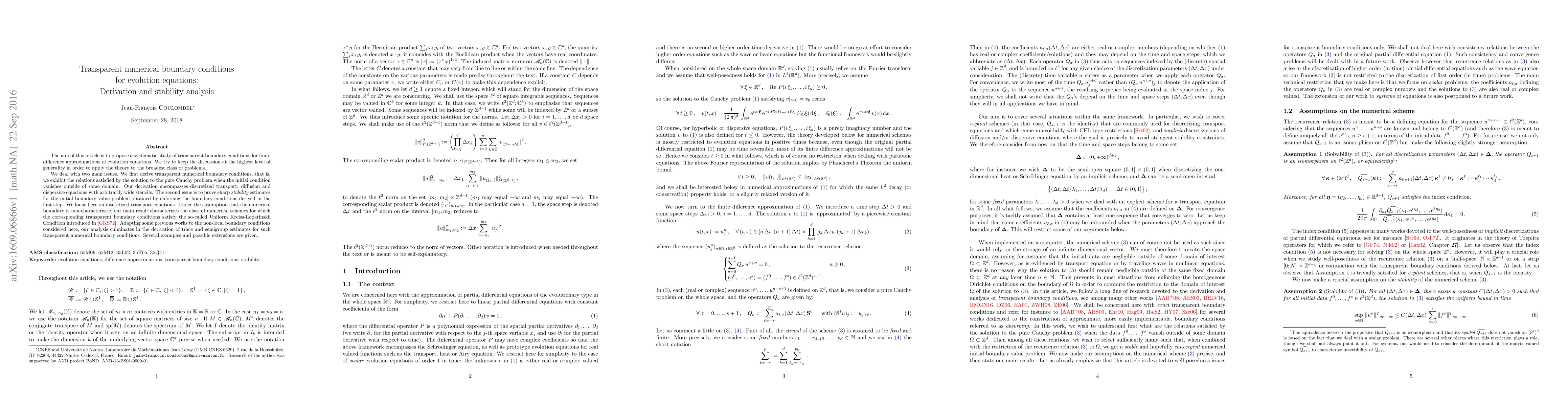 This paper proposes transparent numerical boundary conditions for finite difference approximations of evolution equations, focusing on transport, diffusion, and dispersive equations. It derives these conditions and provides sharp stability estimates, ensuring the conditions satisfy the Uniform Kreiss-Lopatinskii Condition, with applications to a broad class of problems.