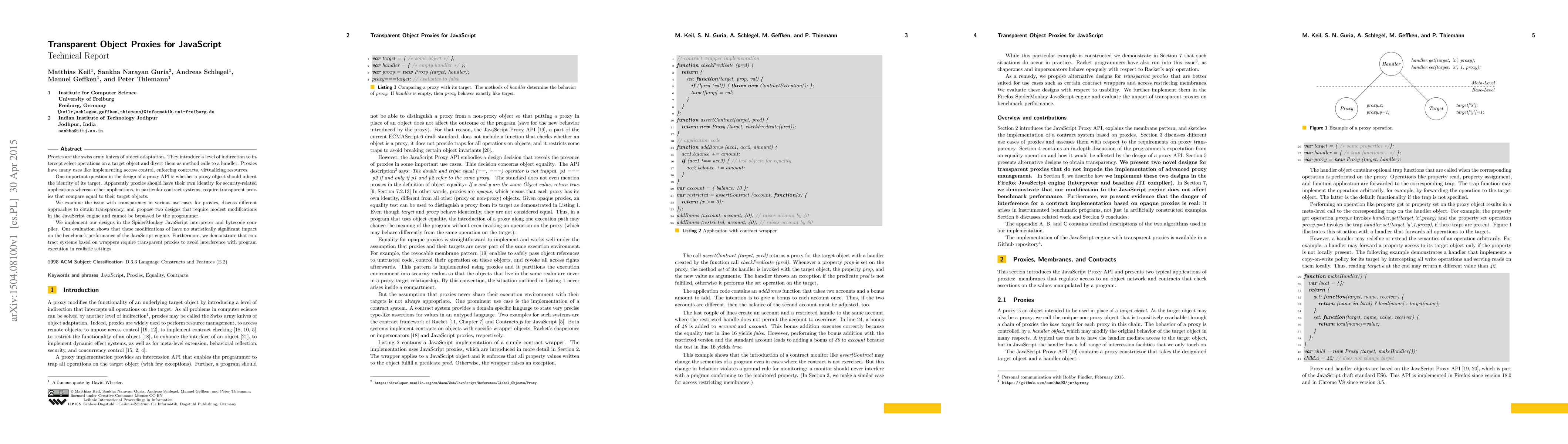This paper discusses the concept of transparent object proxies in JavaScript, emphasizing their importance for contract systems and other applications. It proposes two design solutions for transparent proxies that require minimal JavaScript engine modifications and ensures they do not significantly impact performance, evaluated through the SpiderMonkey interpreter.
