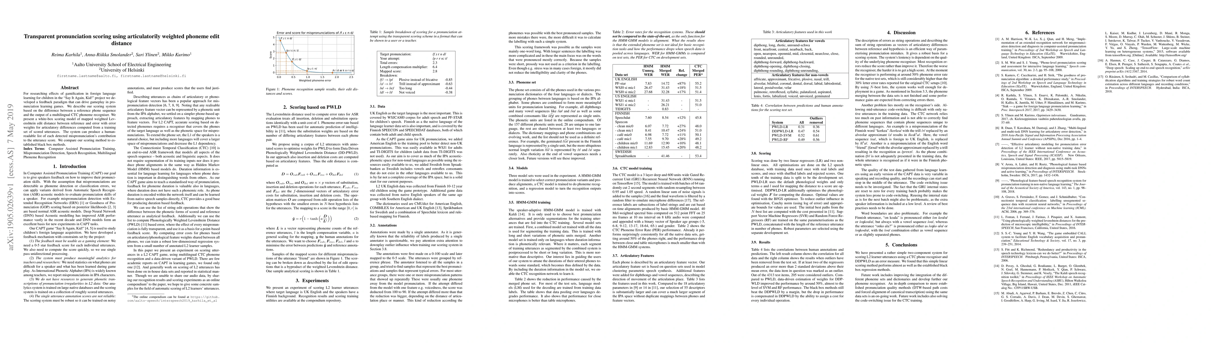 This paper introduces a transparent pronunciation scoring system for children's language learning games, using an articulatorily weighted phoneme edit distance based on a multilingual CTC phoneme recognizer. The system provides clear feedback on mispronunciations and compares its performance to traditional black-box methods.