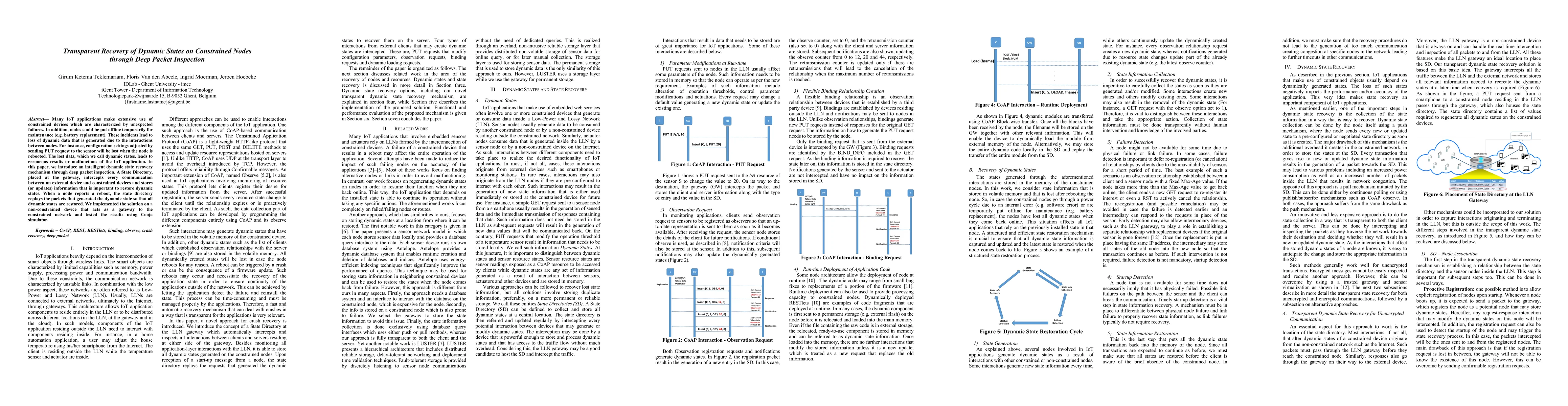 Many IoT applications make extensive use of constrained devices which are characterized by unexpected failures. In addition, nodes could be put offline temporarily for maintenance (e.g. battery replacement). These incidents lead to loss of dynamic data that is generated due to the interactions between nodes. For instance, configuration settings adjusted by sending PUT request to the sensor will be lost when the node is rebooted. The lost data, which we call dynamic states, leads to erroneous results or malfunctions of the IoT application. In this paper, we introduce an intelligent dynamic state recovery mechanism through deep packet inspection. A State Directory, placed at the gateway, intercepts every communication between an external device and constrained devices and stores (or updates) information that is important to restore dynamic states. When a node reports a reboot, the state directory replays the packets that generated the dynamic state so that all dynamic states are restored. We implemented the solution on a non-constrained device that acts as a gateway to the constrained network and tested the results using Cooja simulator.