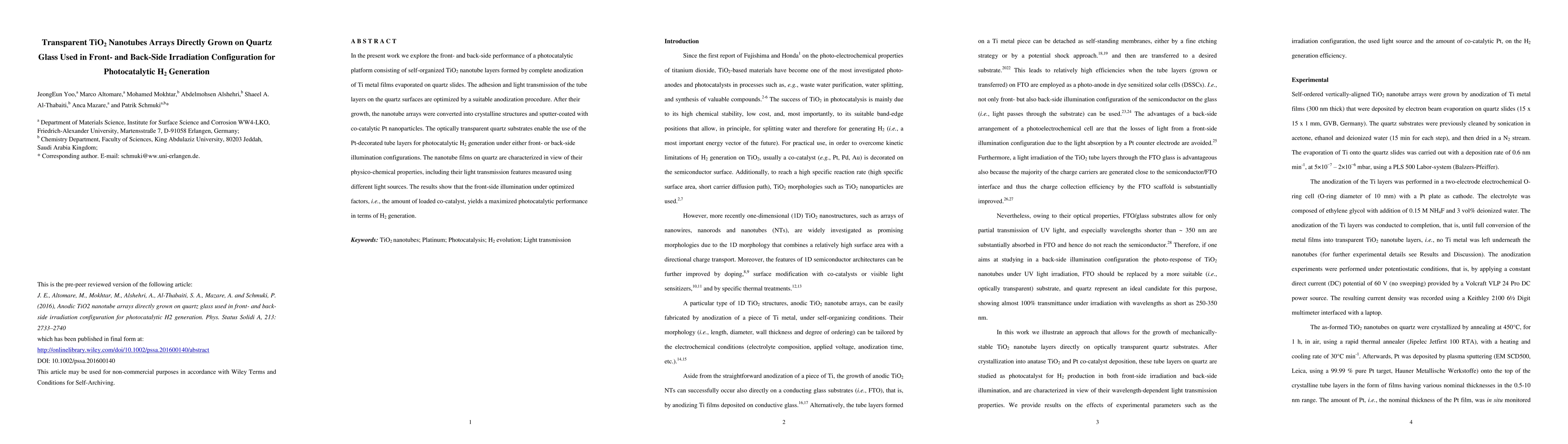 This study investigates the photocatalytic performance of transparent TiO2 nanotube arrays on quartz glass under front- and back-side illumination for H2 generation, finding that front-side illumination with optimized co-catalyst loading maximizes H2 production. The nanotubes' light transmission and adhesion are optimized through anodization, and their crystalline structure is enhanced with Pt nanoparticles.