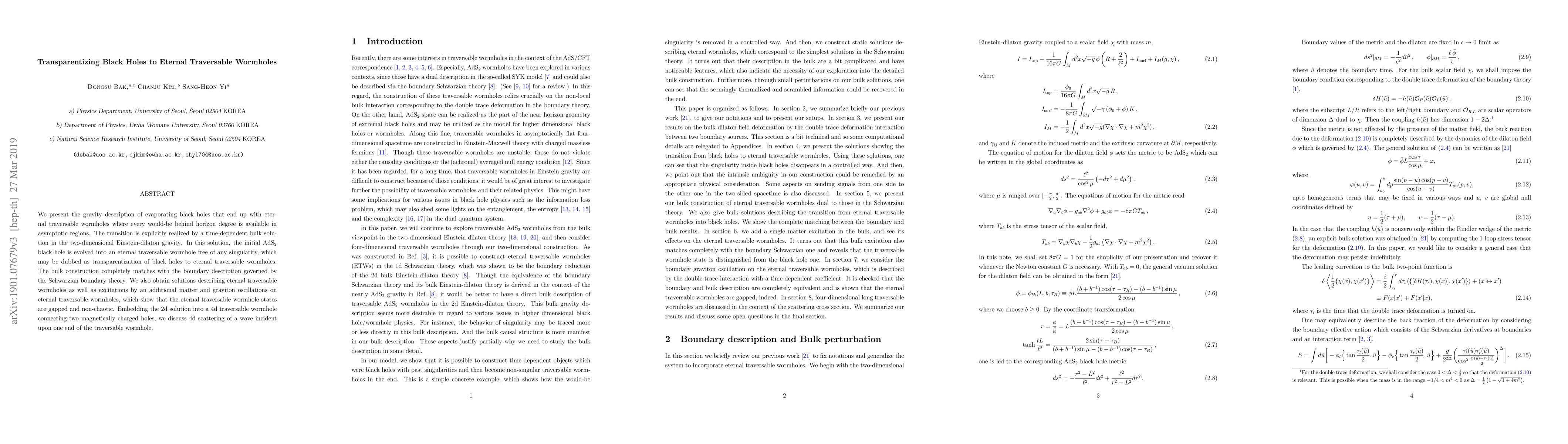 This paper describes a gravity model where evaporating black holes transition into eternal traversable wormholes without singularities, achieved through a time-dependent bulk solution in Einstein-dilaton gravity. The wormholes are shown to be gapped and non-chaotic, and a 4d traversable wormhole model is also discussed with wave scattering implications.