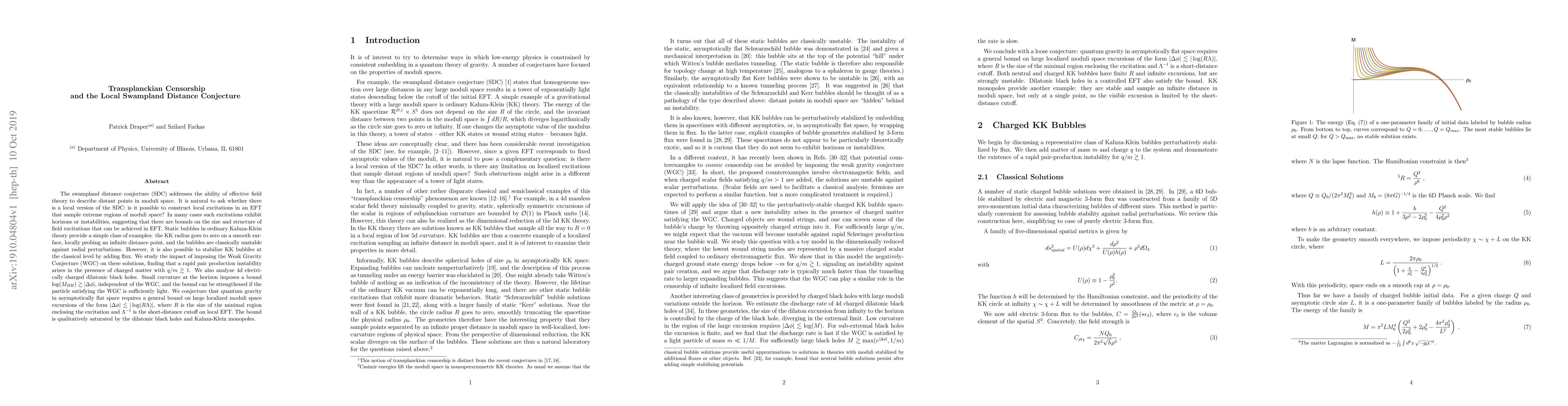 The swampland distance conjecture (SDC) addresses the ability of effective field theory to describe distant points in moduli space. It is natural to ask whether there is a local version of the SDC: is it possible to construct local excitations in an EFT that sample extreme regions of moduli space? In many cases such excitations exhibit horizons or instabilities, suggesting that there are bounds on the size and structure of field excitations that can be achieved in EFT. Static bubbles in ordinary Kaluza-Klein theory provide a simple class of examples: the KK radius goes to zero on a smooth surface, locally probing an infinite distance point, and the bubbles are classically unstable against radial perturbations. However, it is also possible to stabilize KK bubbles at the classical level by adding flux. We study the impact of imposing the Weak Gravity Conjecture (WGC) on these solutions, finding that a rapid pair production instability arises in the presence of charged matter with $q/m\gtrsim 1$. We also analyze 4d electrically charged dilatonic black holes. Small curvature at the horizon imposes a bound $\log(M_{BH})\gtrsim |\Delta\phi|$, independent of the WGC, and the bound can be strengthened if the particle satisfying the WGC is sufficiently light. We conjecture that quantum gravity in asymptotically flat space requires a general bound on large localized moduli space excursions of the form $ |\Delta\phi|\lesssim |\log(R\Lambda)|$, where $R$ is the size of the minimal region enclosing the excitation and $\Lambda^{-1}$ is the short-distance cutoff on local EFT. The bound is qualitatively saturated by the dilatonic black holes and Kaluza-Klein monopoles.