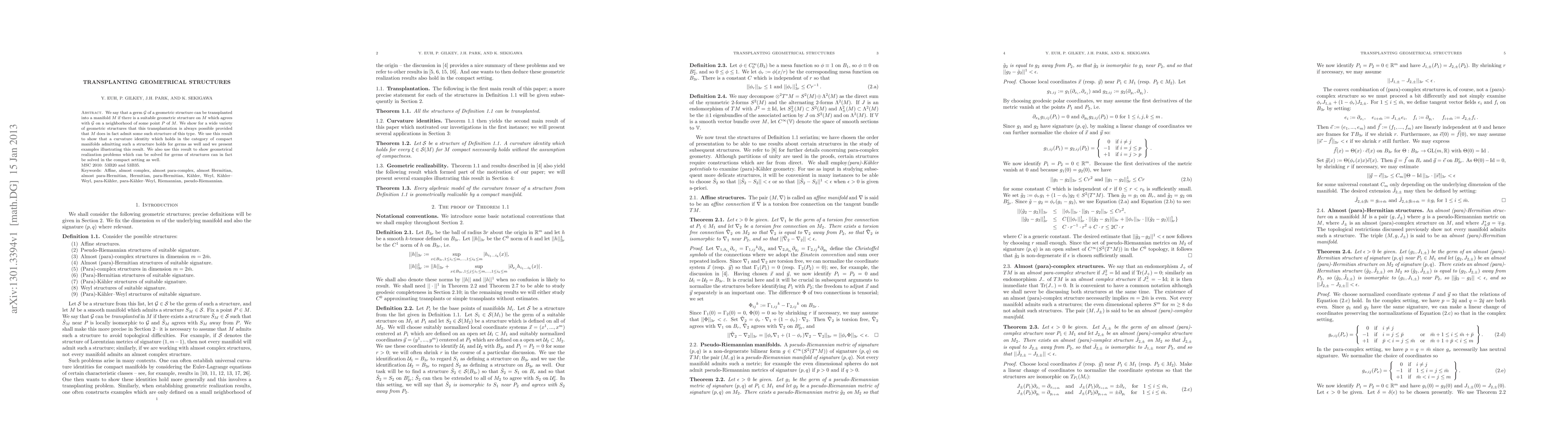 We say that a germ G of a geometric structure can be transplanted into a manifold M if there is a suitable geometric structure on M which agrees with G on a neighborhood of some point P of M. We show for a wide variety of geometric structures that this transplantation is always possible provided that M does in fact admit some such structure of this type. We use this result to show that a curvature identity which holds in the category of compact manifolds admitting such a structure holds for germs as well and we present examples illustrating this result. We also use this result to show geometrical realization problems which can be solved for germs of structures can in fact be solved in the compact setting as well.